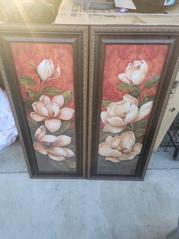 They have damage on bottom due to moving. Cuadros de Magonlias de Homen Interiors. Daño abajo de los cuadros.