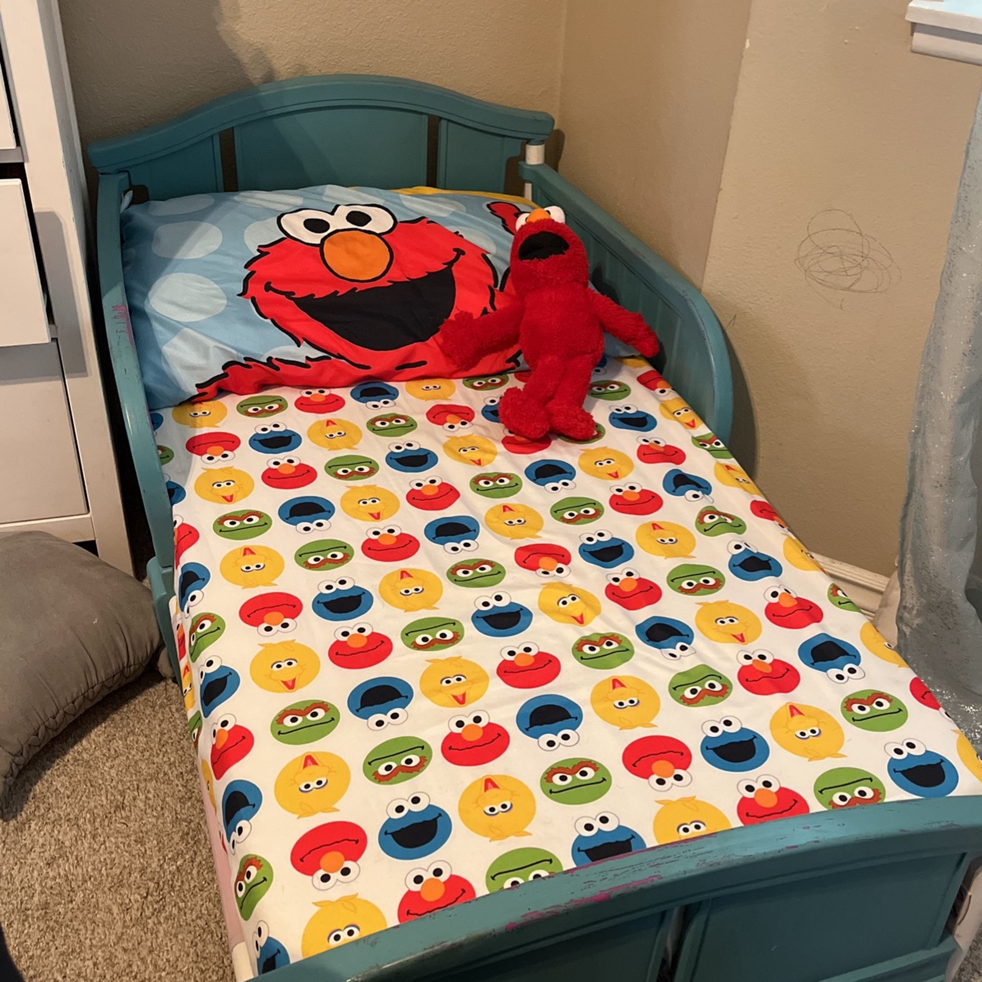 Toddler bed was painted teal for a boy some scratches show the purple underneath. Son almost never used. You know how that goes they love sleeping in your bed and not their own lol. Great almost perfect condition on the mattress. It’s an expensive mattress temperpedic and all organic material. Modera Baby Mattress. Mattress was purchased for $150. Sold together or with the Sesame Street sheet comforter pillow and a brand new Elmo doll for $50 extra.