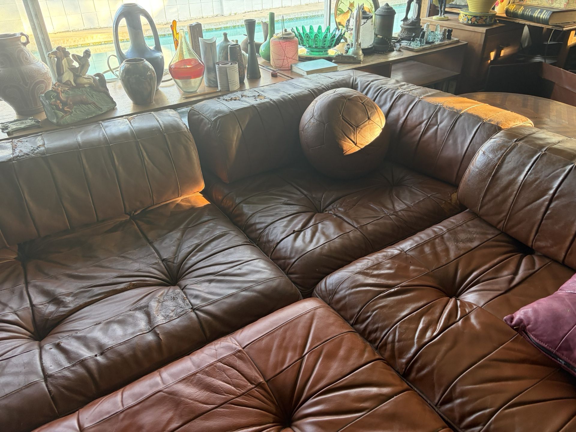 Authentic De Sede Modular Leather Sectional – 7–8 Piece Set – Swiss Design – Restoration Ready Price: $10,500 OBO Description: Authentic vintage De Sede modular leather sectional sofa, Swiss-made luxury design from the 1970s–80s. This is a complete 7–8 module set with the iconic hand-stitched patchwork leather construction De Sede is known for. Extremely heavy, overbuilt frames and deep, comfortable seating. The sofa has been professionally cleaned, steamed, thoroughly vacuumed, and fully conditioned/oiled. There is no odor or storage damage. Structural frames and support are excellent. Condition / Notes: Leather shows age and has visible tears on several panels, which is reflected in the price. This model uses individual patch panels that can be replaced, making it a strong candidate for professional leather repair or selective panel restoration rather than full re-upholstery. All modules are present and align properly. Cushions and frames are solid. Why This Piece: • Genuine Swiss De Sede modular system • Thick, full-grain aniline leather • Hand-stitched patchwork construction • Interchangeable modules — configure as corner, long sofa, or separate chairs • Highly collectible modern design brand • Ideal for restoration, staging, or custom leather project Approx. Dimensions (per module): Please measure to confirm; modules are large and heavy. Pickup / Delivery: Local pickup preferred due to size and weight. Buyer responsible for moving or arranging delivery. Summary: This is not a reproduction or flat-pack furniture — it’s a true European luxury design piece with excellent structure and significant upside after panel repair. Priced for a knowledgeable buyer who appreciates original De Sede construction and the value of a complete modular set. Serious inquiries only.