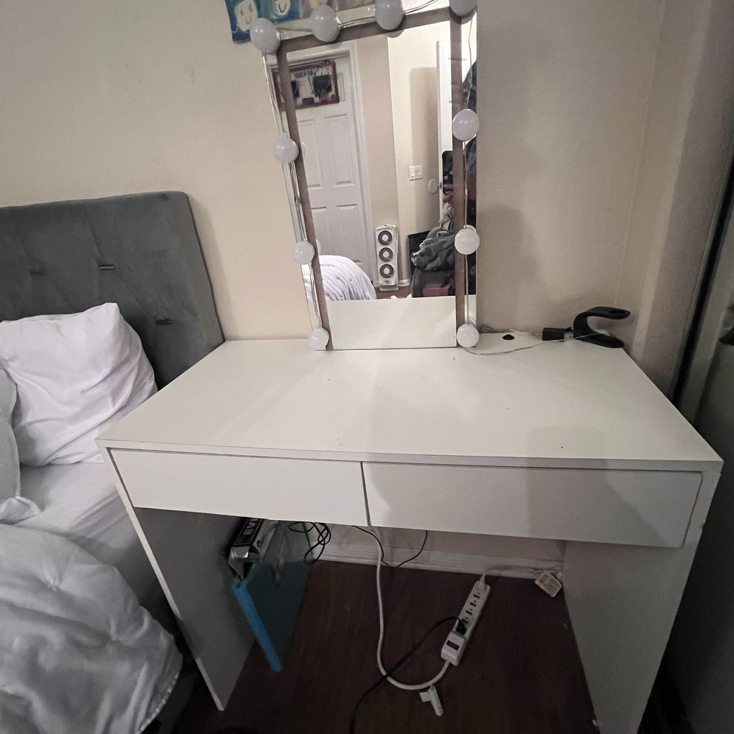 White makeup vanity with 2 drawers. Lights on vanity mirror turn up but I also added addition bulbs for additional brightness. Both lights options work well, the light bulb ones can adjust the brightness or lighting. $100 OBO NEED GONE ASAP- Pick up only