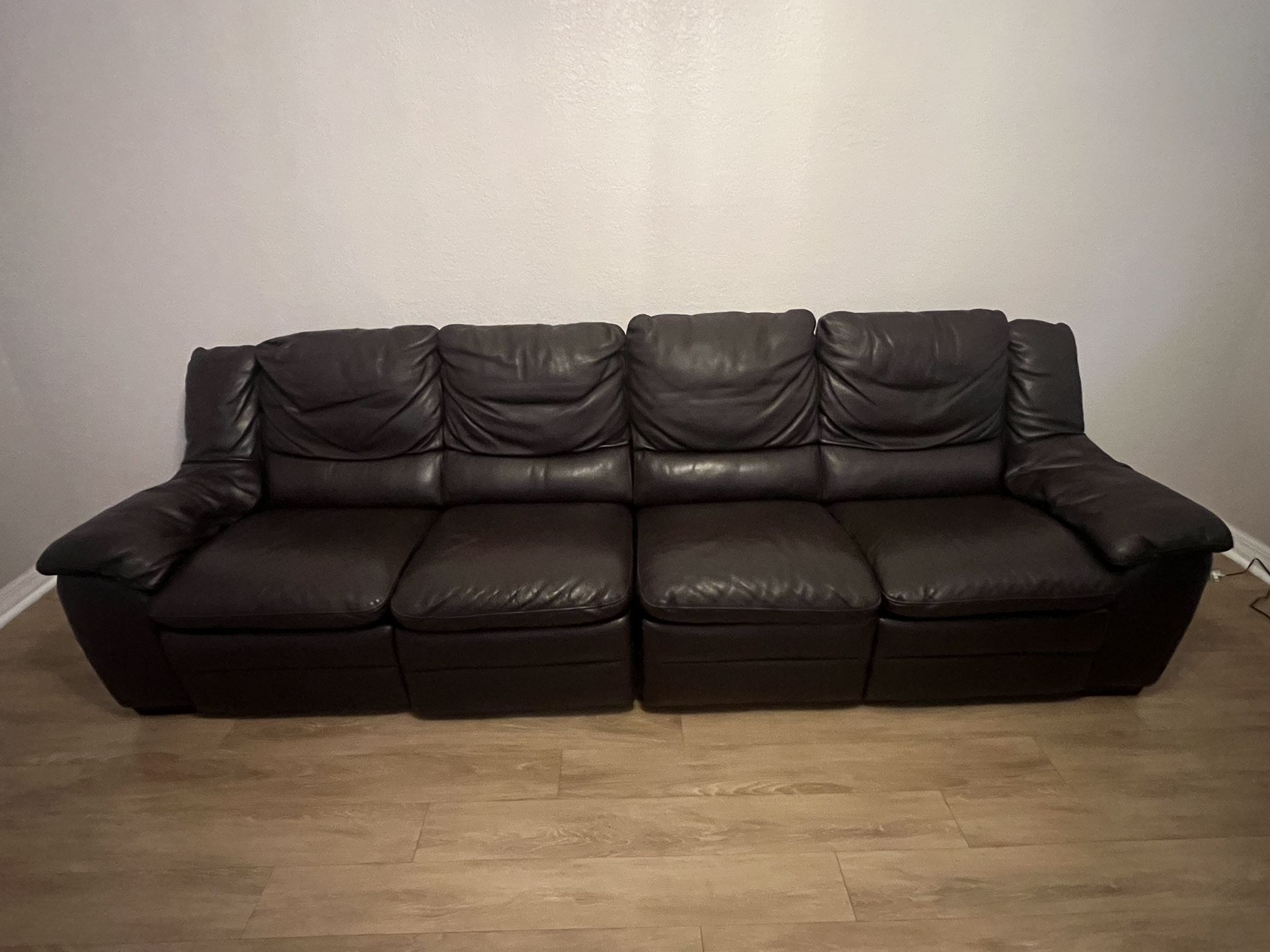Comfortable genuine leather reclining sofa with 4 seats. Both ends recline, great for relaxing, watching TV, or lounging. • Color: Dark brown • Material: Leather • Manual recliners on both sides • Clean, well kept • Smoke-free home • Good overall condition ———————————————————————————— Sofá reclinable de cuero genuino, muy cómodo y espacioso. Cuenta con 4 asientos y reclinables en ambos extremos, perfectos para relajarse viendo TV o descansando. • Color: Marrón oscuro • Material: Cuero • Reclinables manuales (lado izquierdo y derecho) • Muy cómodo y firme • Hogar libre de humo • En buen estado general