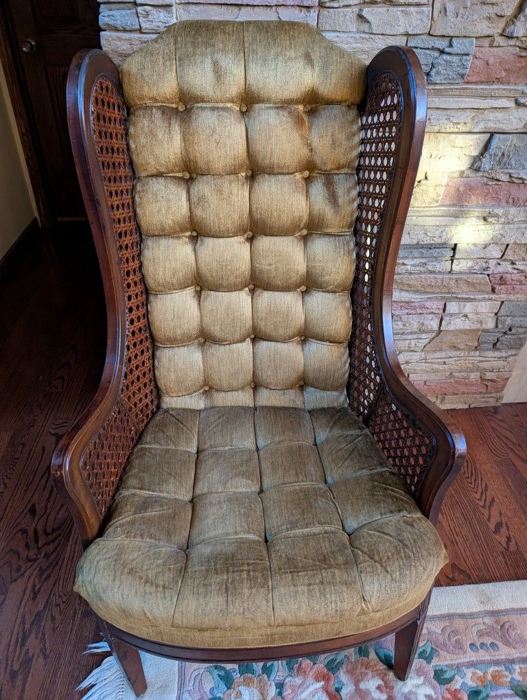 Vintage Cane Wingback Tufted Gold Velvet Armchair