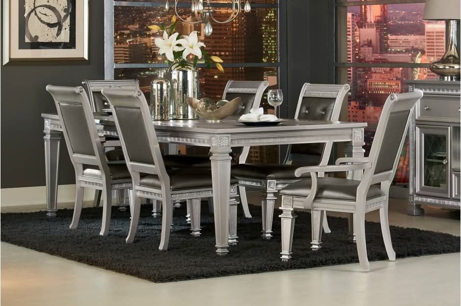β¨ Modern Glamour β Bevelle Collection Bring bold elegance to your home with the Bevelle Collection. Featuring a stunning silver finish, sparkling acrylic crystal trim, and medallion details, each piece reflects sophistication and shine. Dark gray faux leather chairs offer stylish contrast, while polished knobs complete the luxe look. Matching bedroom set also available. π Various sizes available π New Arrival β Limited Stock