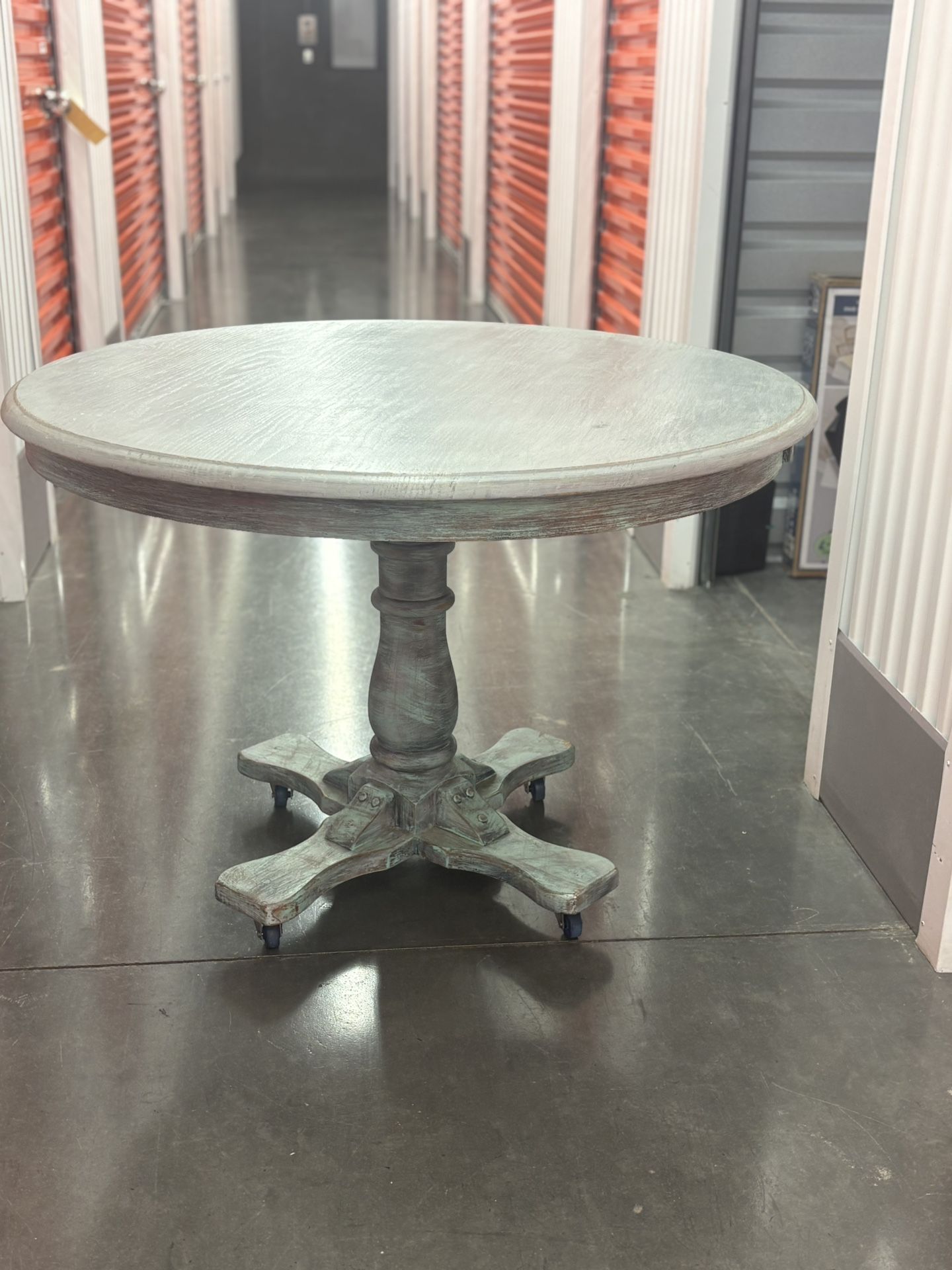 Table for 50$ obo Pick up in lake Forest Has wheels Round dining table 41 inches width 29 inches tall