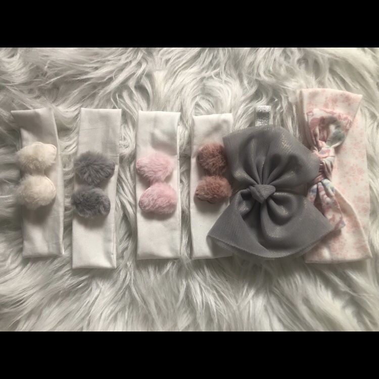 Six headbands for baby/toddler. Four are white with fuzzy bows; very stretchy. One has a big silver bow with gold shine and a silver sparkle stretchy/elastic headband. One is cloth (not as stretchy as the others), floral print and has a bow. Pre-loved and in excellent condition. Zoom into pics for wear. Have a lovely day!