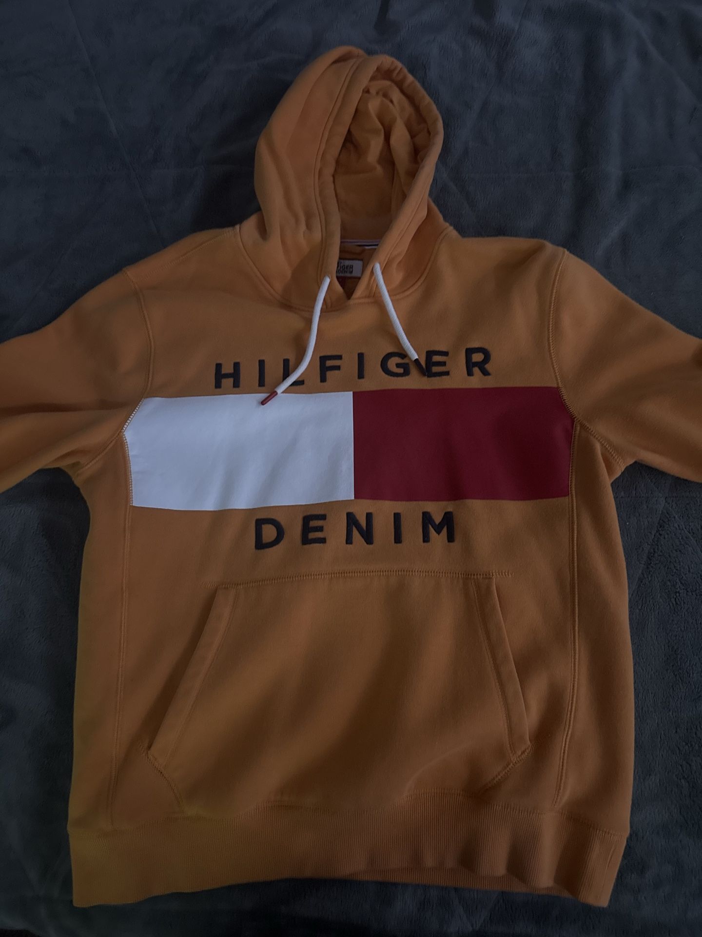 Tommy Hilfiger Denim Yellow Red White Fleece Hoodie Pullover Logo L