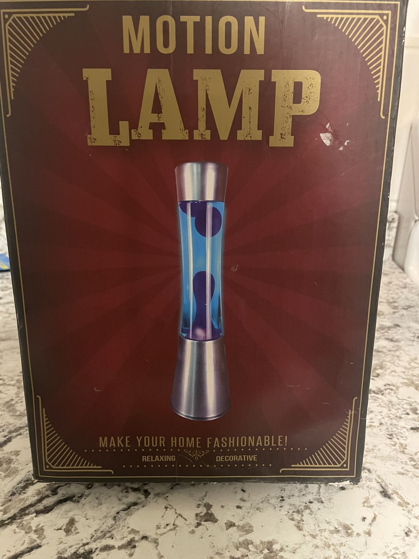 Hey, I've got a brand new motion lamp in the box! It's got an aluminum base and cap, and it uses a 30 watt bulb that you can easily swap out when it gets old. Just plug it in and you're good to go - it's AC operated. It's pretty compact too, at 4.4in x 15.7in. The lamp is filled with blue liquid and purple wax, giving it a really cool look.