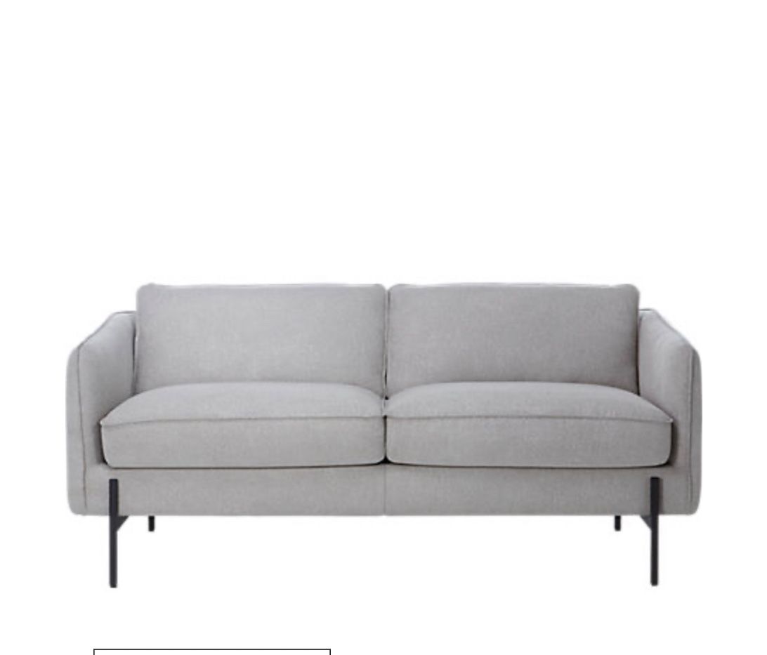 Elegant, clean-lined loveseat by CB2. Upholstered in a neutral light gray / oatmeal fabric with sleek black metal legs (or dark legs). • Excellent cosmetic condition: minimal wear, no major stains or tears (add any detail about wear) • Smoke-free, pet-free home (or note any pets) For pickup only. (downtown Miami) Overall Dimensions (in inches) Width: 67 in Height: 30 in Depth: 37.5 in