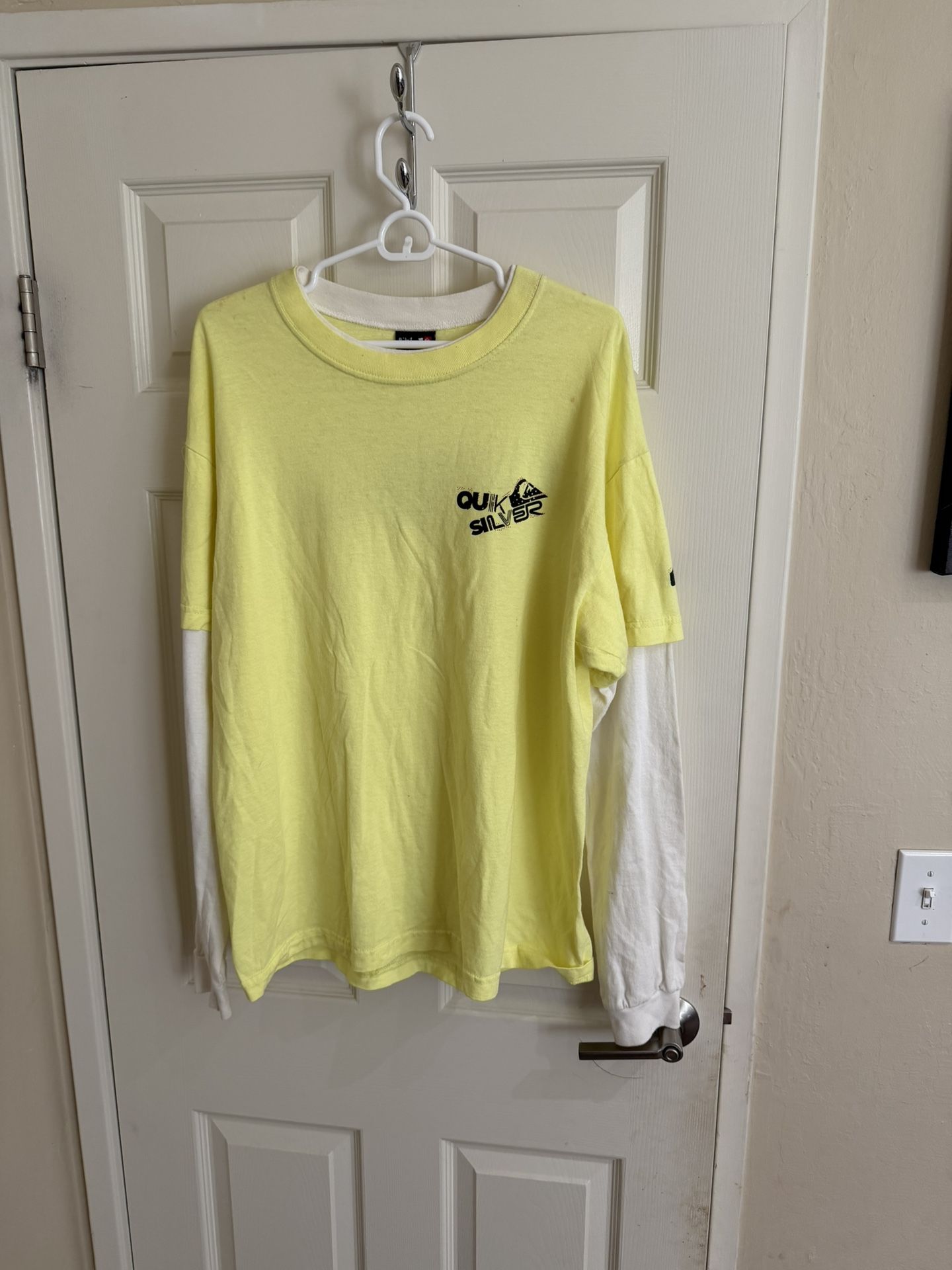 Vintage Quiksilver Layered Tee - 90s/Y2K Retro Vibe Get ready to turn heads with this awesome vintage Quiksilver layered t-shirt! This unique piece perfectly captures the retro style of the 90s and Y2K eras, making it a must-have for any vintage enthusiast. The layered design adds instant cool, offering a distinctive look that's both stylish and comfortable. Featuring a bright yellow outer layer paired with a classic white long sleeve underneath, this tee is a standout piece. The Quiksilver logo on the front adds a touch of authentic surf culture. Made from quality materials, this shirt combines a great look with durability. Embrace the nostalgia and add some vintage flair to your wardrobe! This Quiksilver layered tee is perfect for casual outings, making a statement, or adding to your collection of unique vintage finds. Don't miss the chance to own a piece of fashion history!