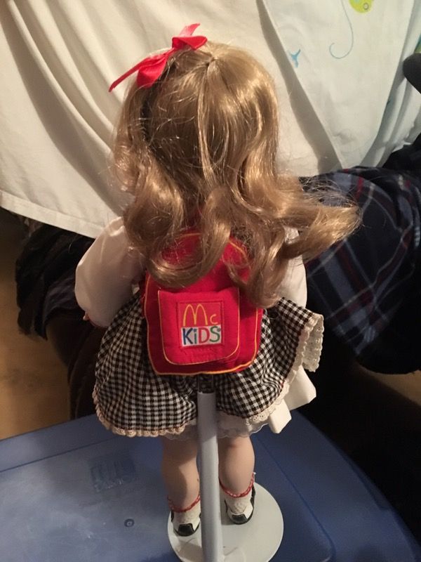 McDonald's doll with back pack on stand