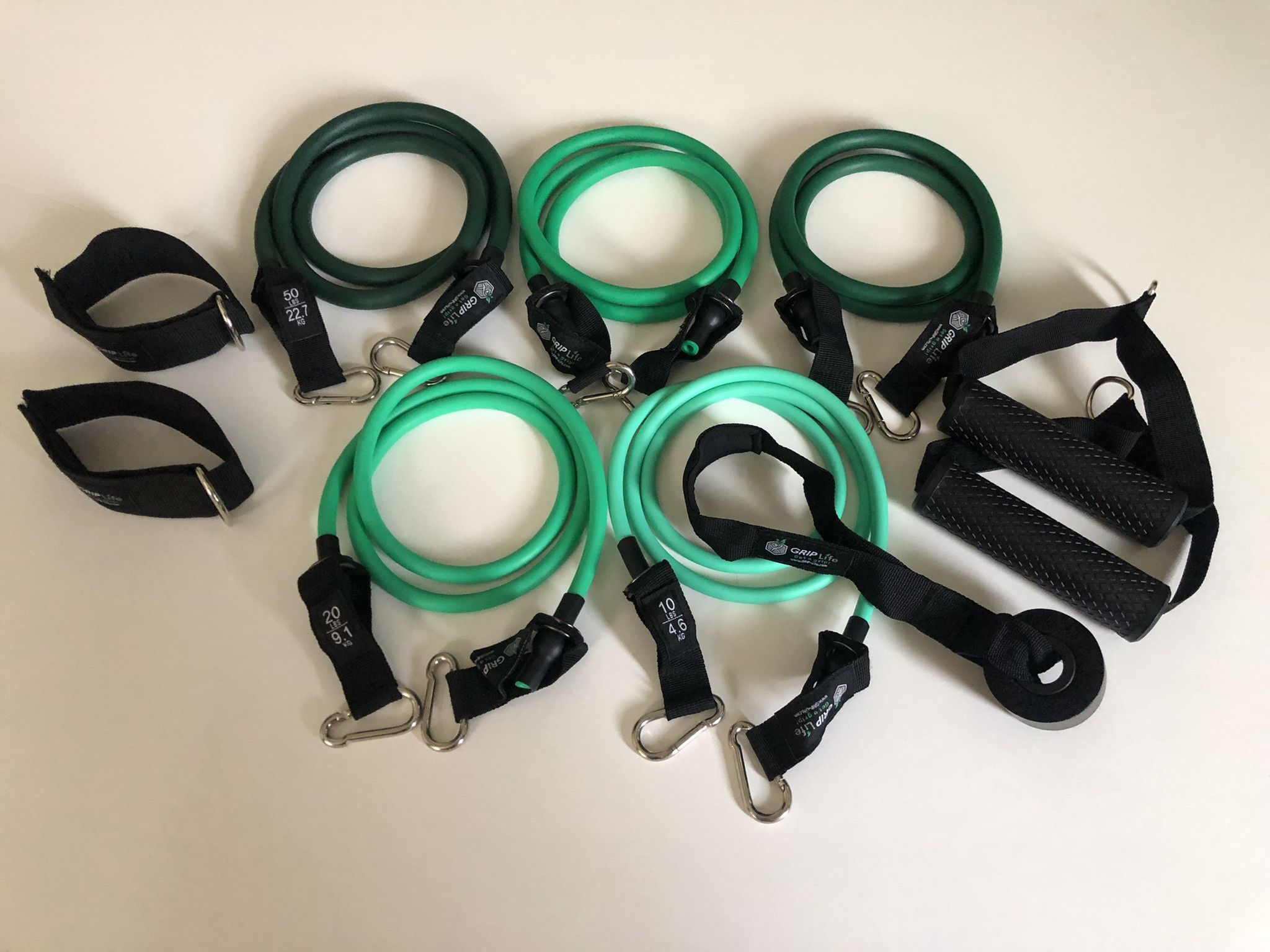 Brand New Multiple Available Non-latex hypoallergenic resistance bands set. Workout in the comfort, convenience, and privacy of your own home with the cable system. Get a total body workout without needing to leave your house! Complete set of (5) bands of various resistance levels, (1) carrying bag, (1) door anchor, (2) hand grips, (2) ankle straps, and exercise guide