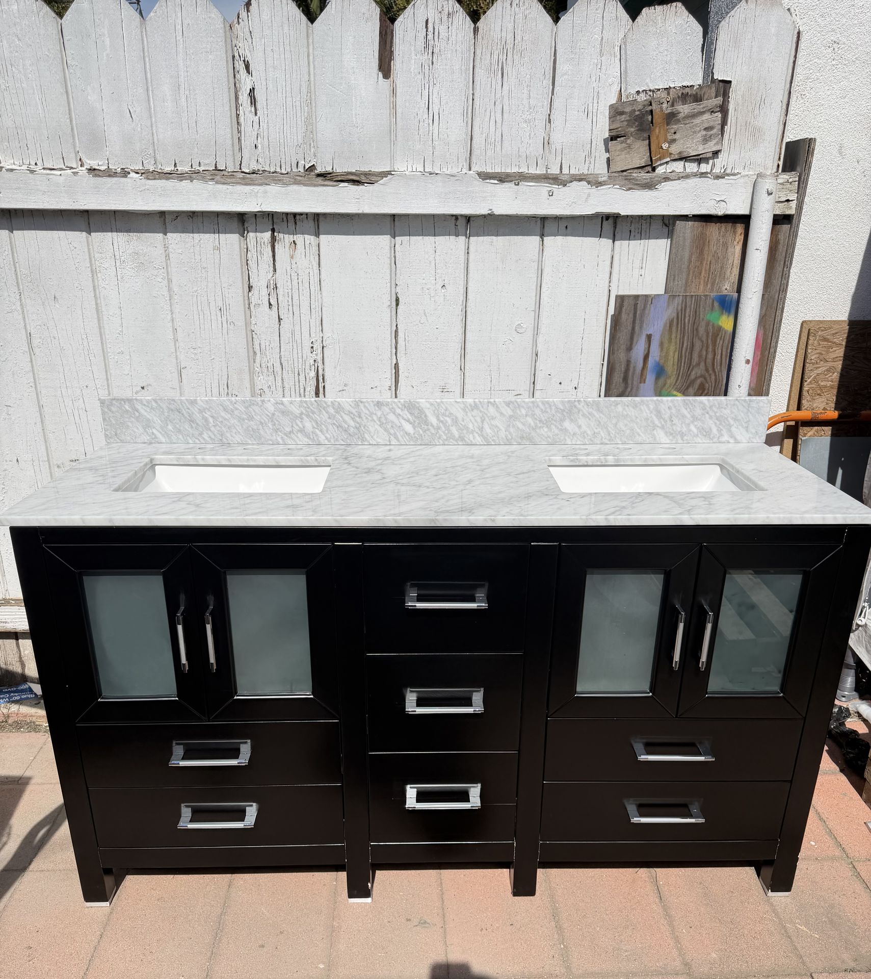 60 inch double sink bathroom vanity. Marble top the cabinet has a few imperfections.