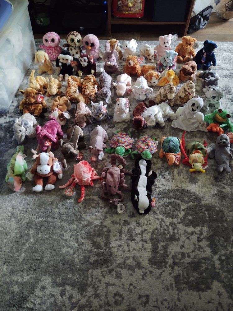 These were my mom's beanie babies collection, 52 in all (a few are doubles), she collected them for years, all are in great condition, never been displayed or played with, been stored in plastic bin for years, all have tag protectors...no stains, rips,tears, fades ext. ... This is A LOT SALE, I will not sell as singles so PLEASE DON'T ASK.... $275...O.B.O..... CASH AND PICKUP ONLY.. ... AND PLEASE, DO NOT MESSAGE, "is this still available"... I will not respond