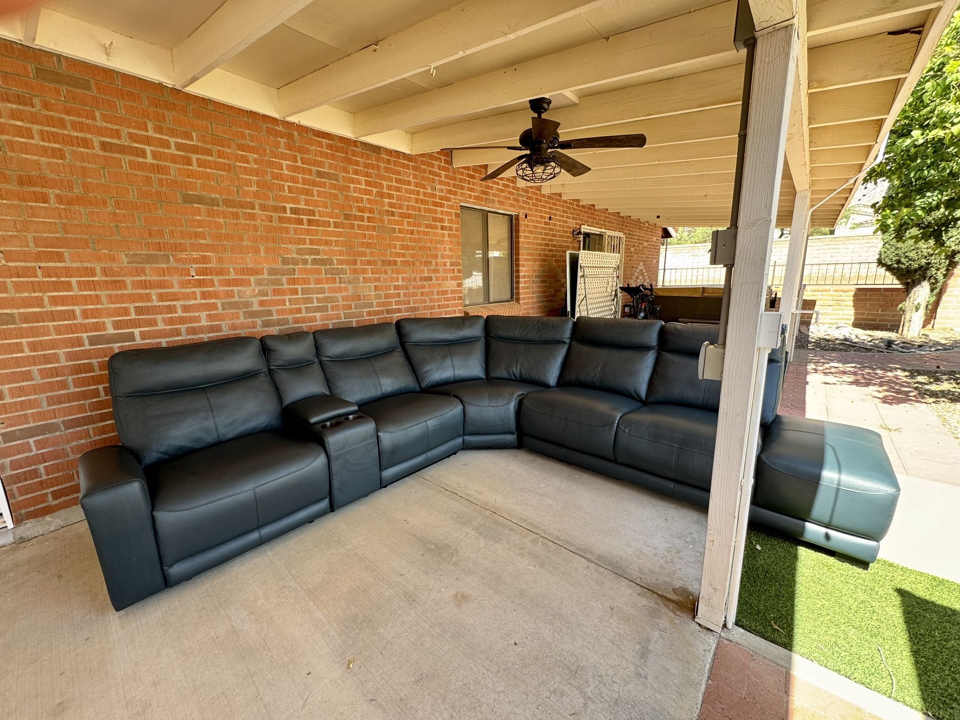 Has a plug in for the seats that recline as well as built in charger ports in the couch itself to charge your electronics or plug anything else into. Does have those small rips on the back of the couch.