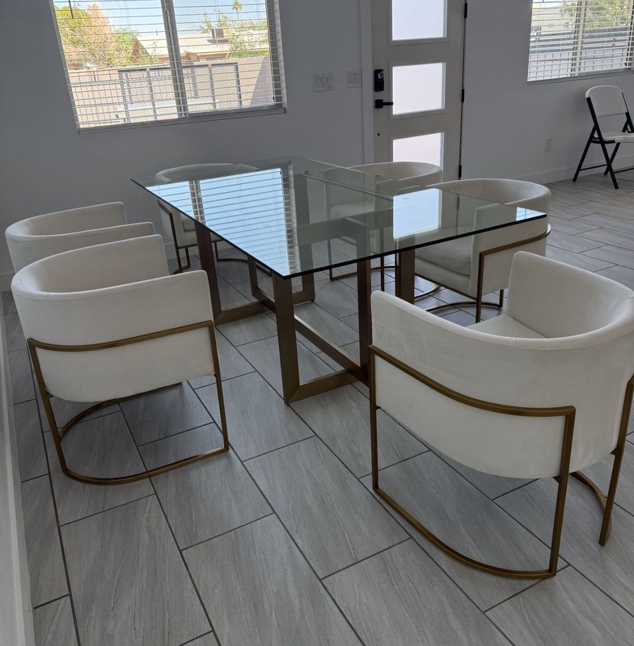 Modern glass dinning table with six chairs. In great condition. Length: 79 inches Width: 39.5 inches Height: 30 inches. Pet free smoke free home.