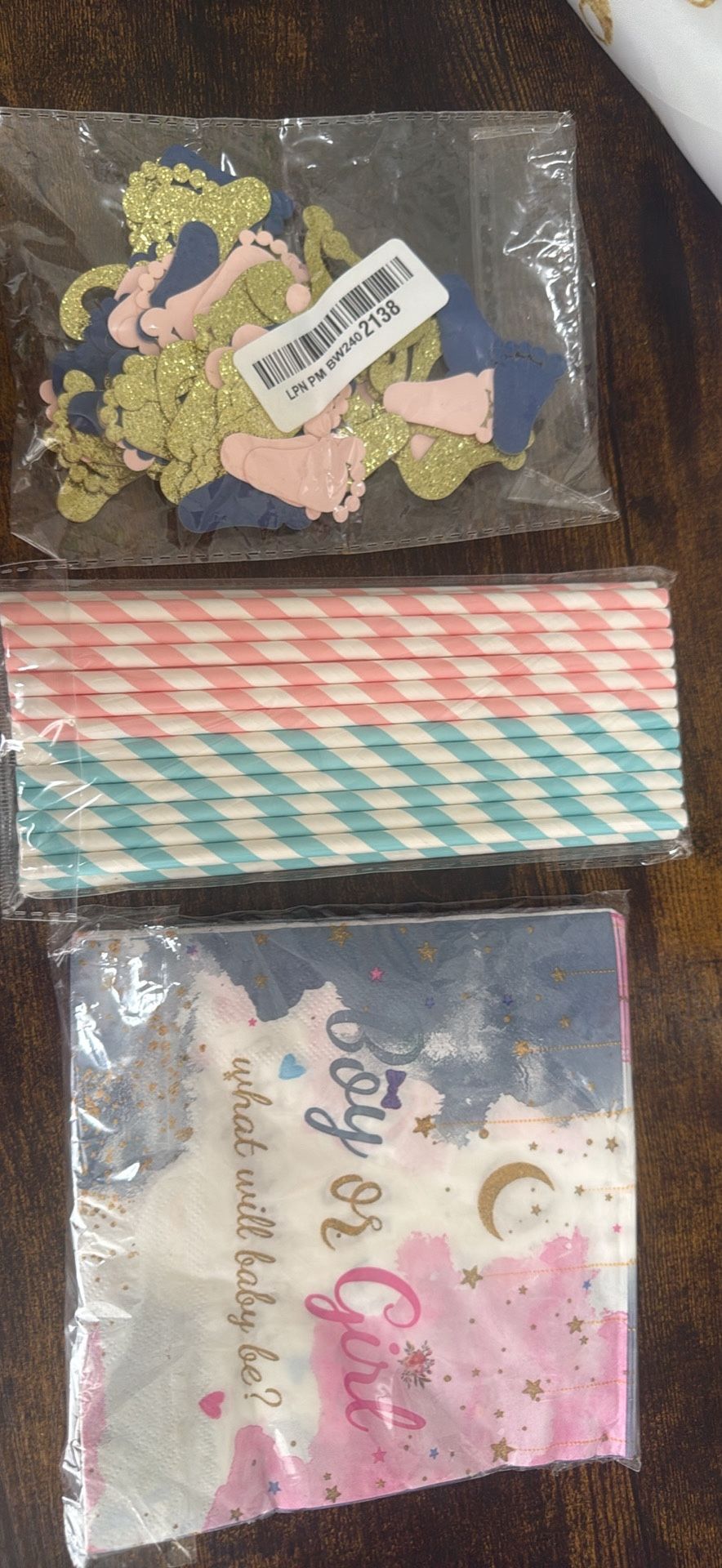 Banner as pictured, confetti, straws, napkins