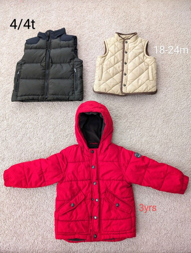 - Baby Gap red jacket. Size 3yrs, has grow with me sleeves never undone. $10 - Janie and Jack tan vest 18-24m $10 -Ralph Lauren Polo down filled vest 4/4t $15 All are in excellent condition. From a smoke/pet free home. Hablo español=)