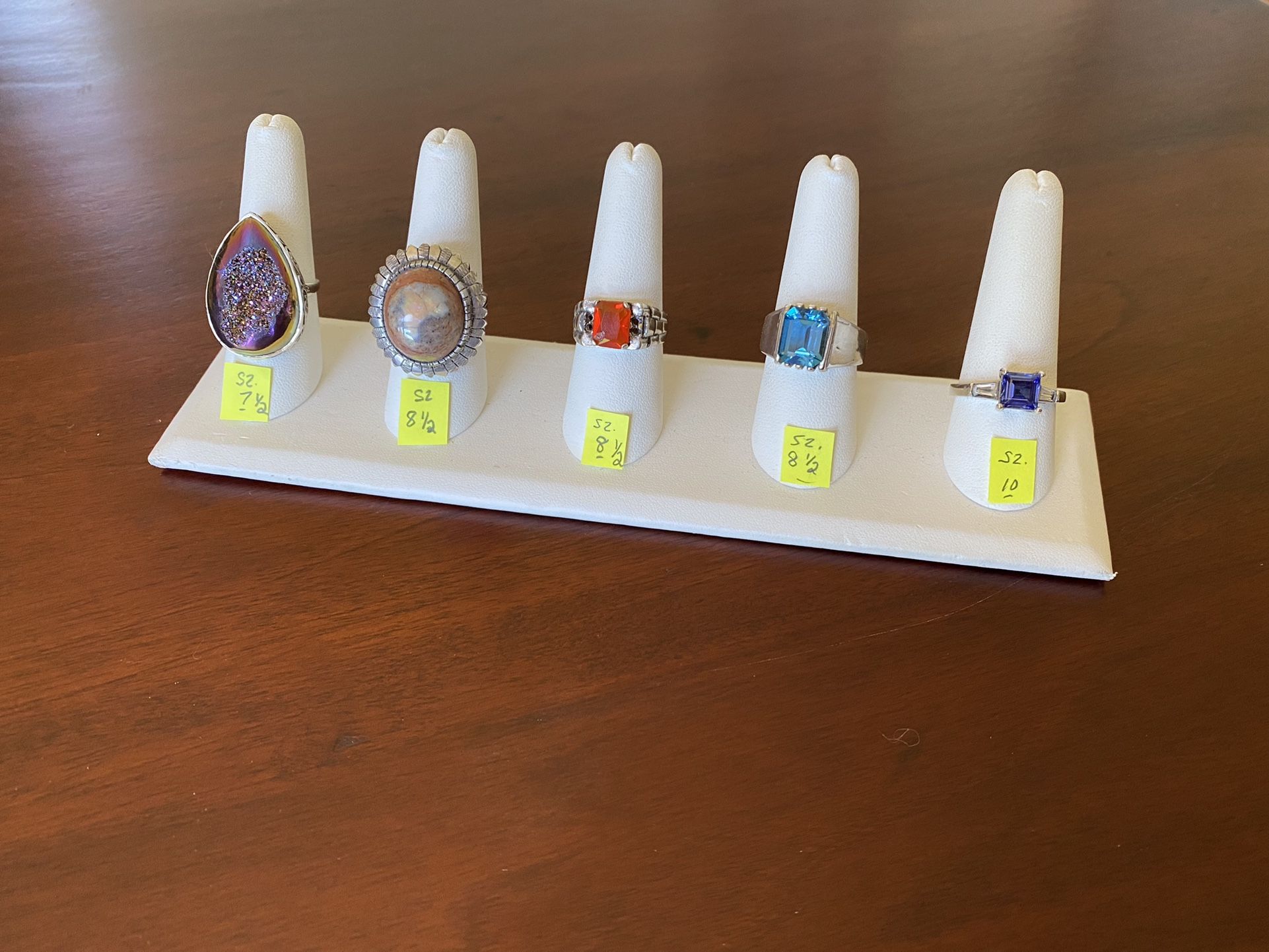 Sterling silver rings $25 each, ($100 if you buy all 5 rings) Dichroic druzy glass sz. 7 1/2 Opal rough sz. 8 1/2 Mexican fire opal sz. 8 1/2 Blue Topaz sz 8 1/2 Lab created tanzanite w 2 cz, sz. 10