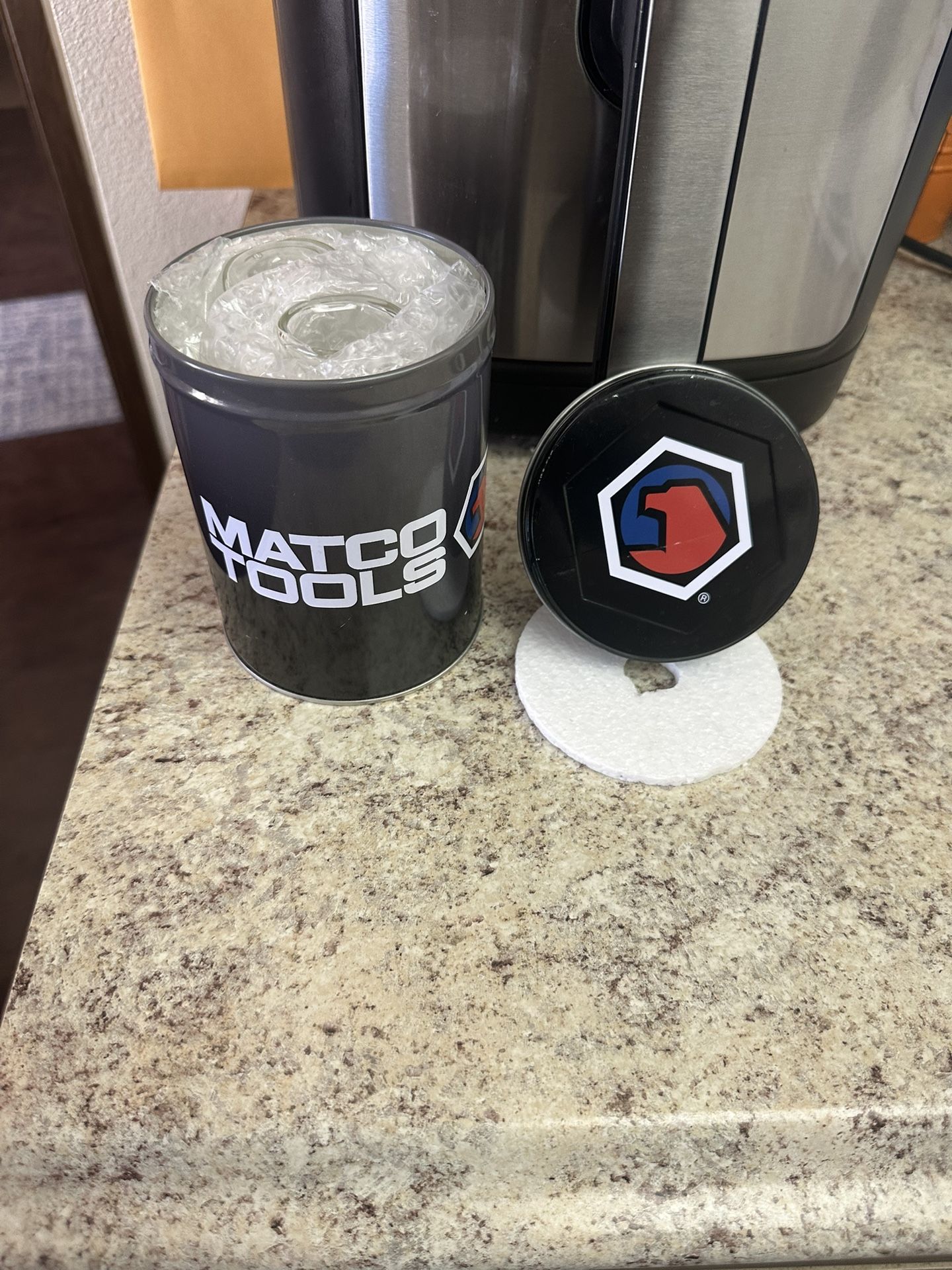 Matco tools, glass socket shot glasses. Brand new, in tin can with lid. Two shot glasses. Asking $75….. send me an offer Very rare collectors item!!!