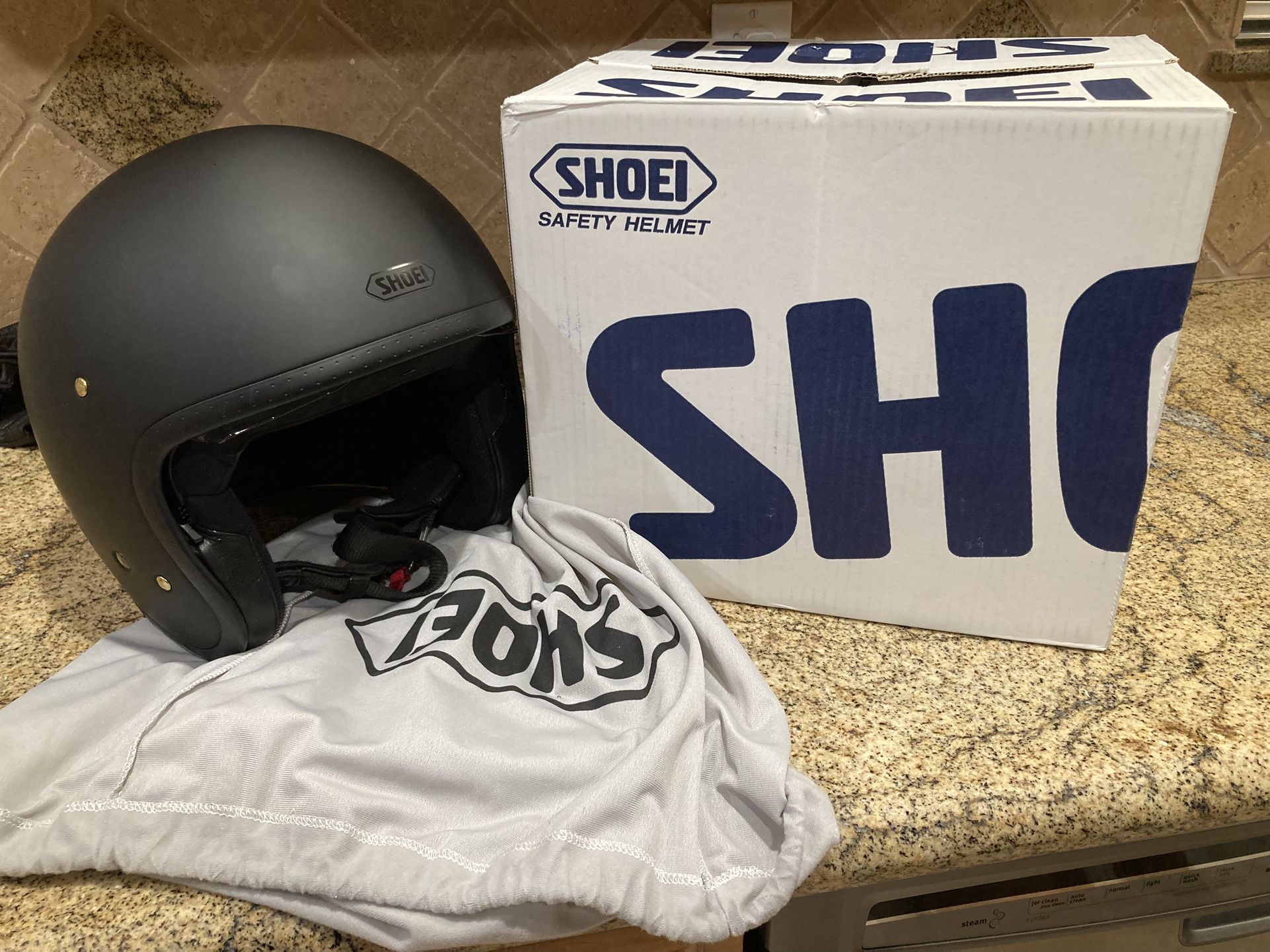 SHOEI JO Matte Black Helmet, XL. Like new, great care; no scratches or blems, no drops. 730 miles of use. Interior very clean. Internal drop down lens is perfect and easily deployed or retracted with finger tip. Lens stays clean and protected from damage and scratches during destination stopovers or helmet storage by retracting 100% into helmet. The clear CJ-3 lens blocks 99% of UVA and UVB rays. It is scratch resistant coated and has tool-free quick release mechanism for easy removal. Very much sought after helmet that I had difficulty getting in 2022. Top quality. I have dated receipt for 419.00
