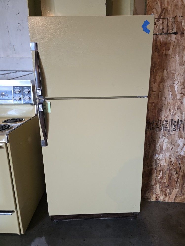 This vintage, 70s, electric, harvest gold Montgomery Ward refrigerator/freezer is part of a four-piece kitchen that I've had removed from a house I'm remodeling. This is from a one-owner home that was built in 1968. At the time of removal, this refrigerator/freezer was functioning. It's dusty but completely intact and relatively clean considering its years of use. Item is sold as-is, no warranty. Buyer must pick up locally or arrange for shipping. CASH ONLY if picked up.
