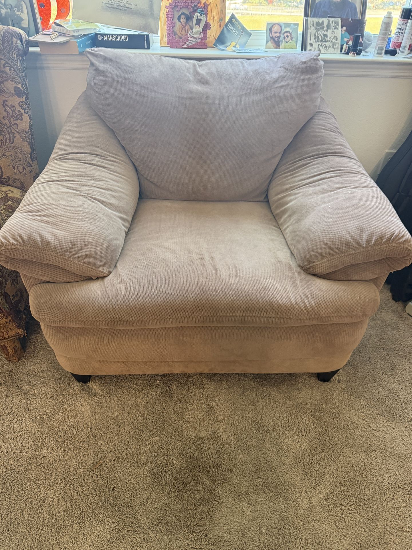 Comfortable oversized armchair with a deep seat and wide padded arms. Soft, plush upholstery in a neutral beige color that fits easily with any living room, bedroom, or reading nook. Supportive cushions make it great for relaxing, gaming, or lounging. Chair is sturdy, clean, and in good condition with normal light wear from use. Perfect as an accent chair or cozy solo seating option.