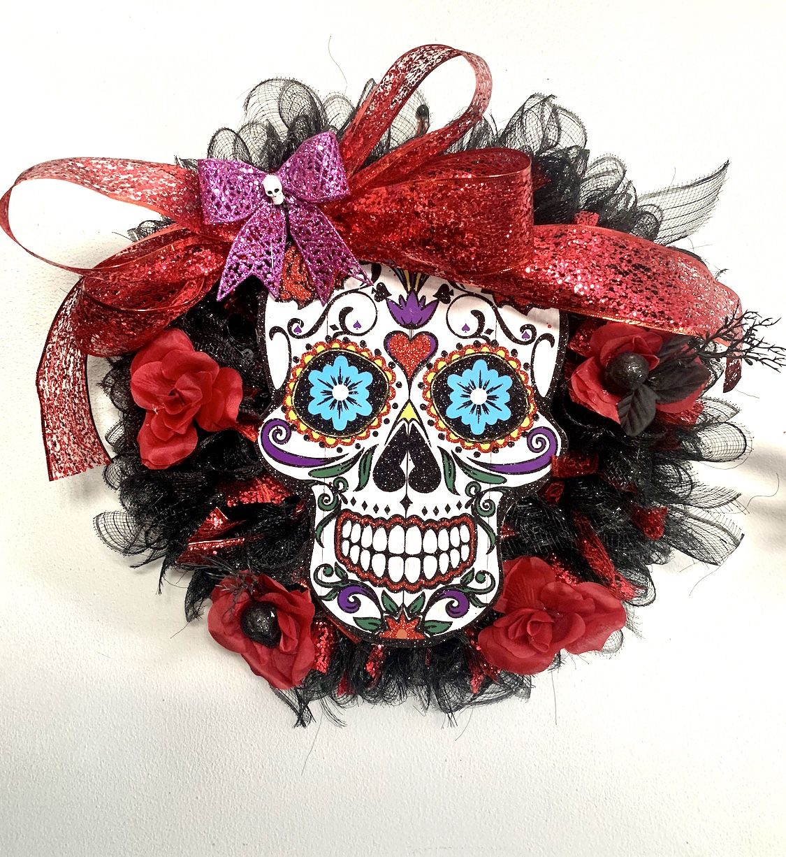 Adorn your door with this Dia De Los Muertos /Day of the Dead Wreath made of black Decco mesh