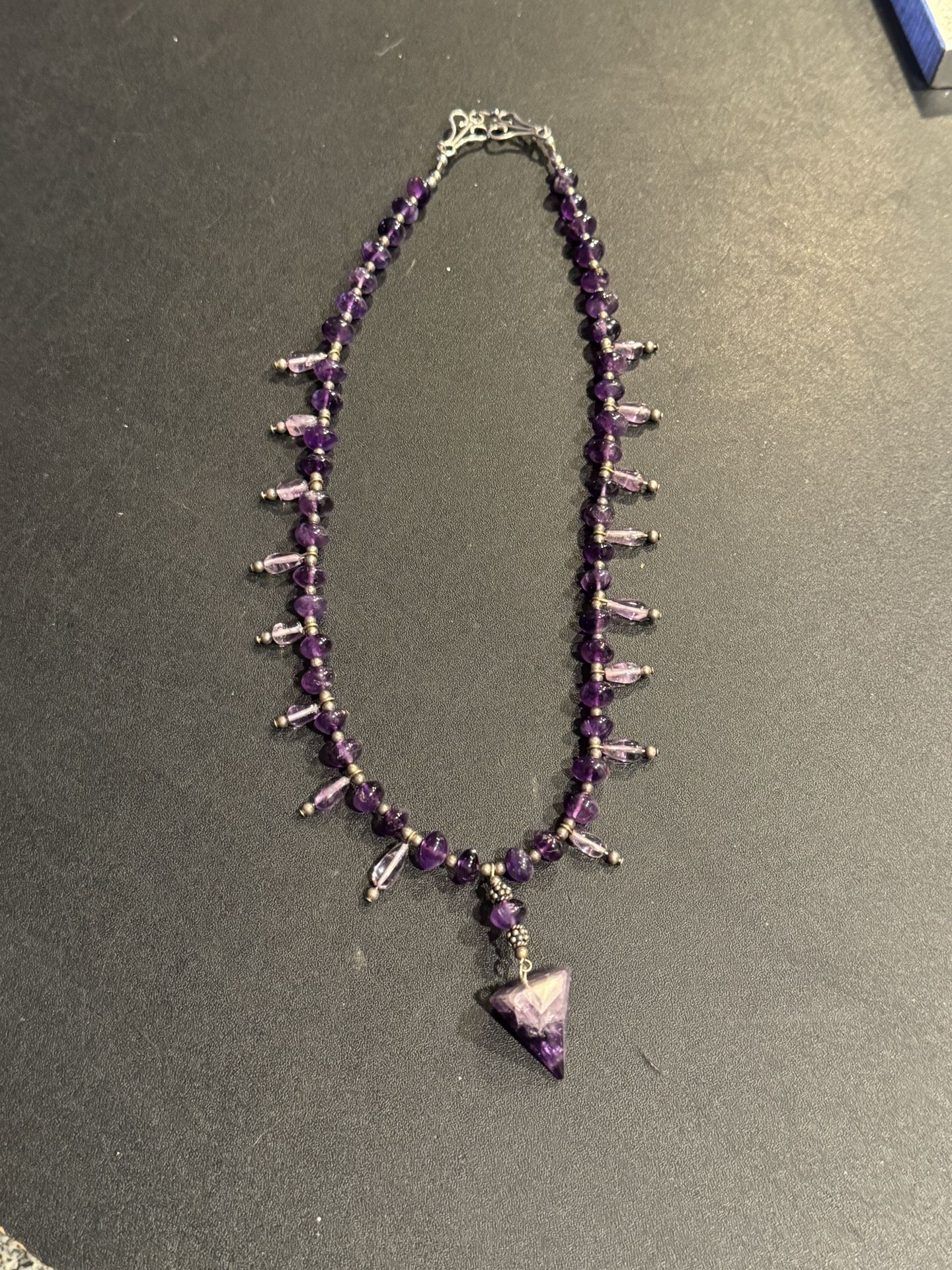 Amethyst and Sterling silver necklace, stunning piece. Marked .925 on hook clasp. 19” length