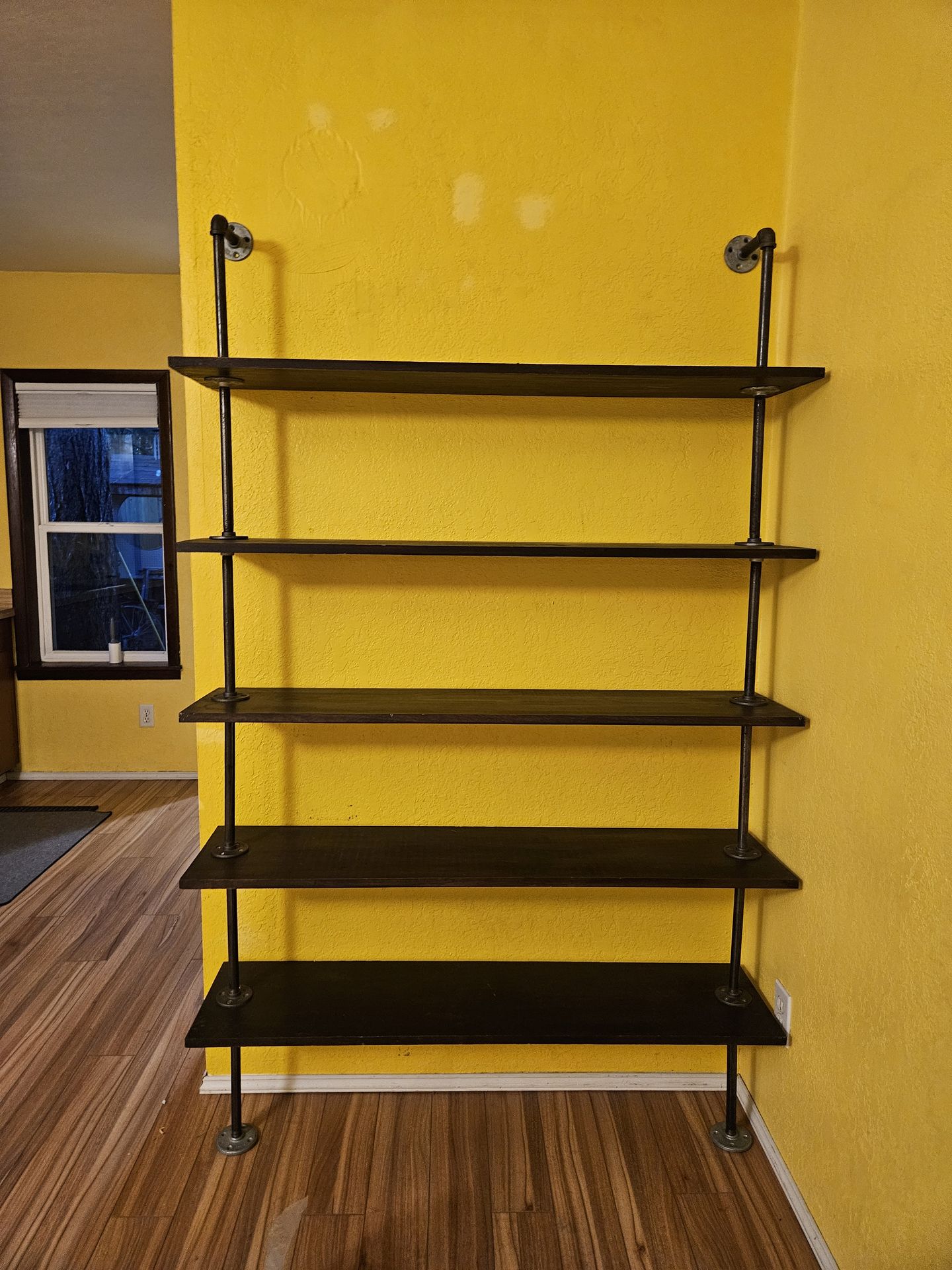 Homemade industrial bookshelf with solid wood and plumbing piping. Easily mounts to wall.