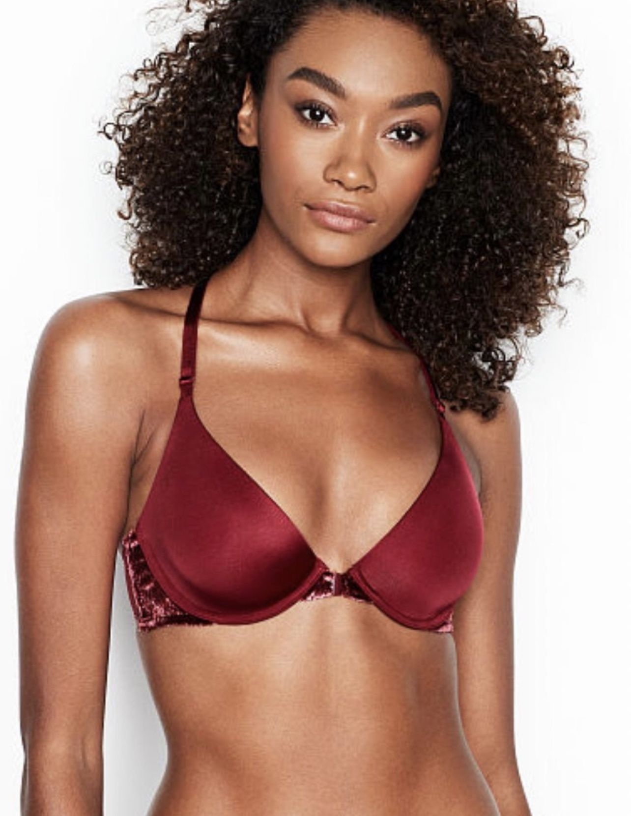 32DD Velvet lightly lined plunge bra by Victoria secret. Naturally sexy look. Front close. Underwire cups, without padding. Featuring luxe velvet details and a silky pink satin lining. Adjustable straps. Beautiful and sexy ruby color. New with tags.