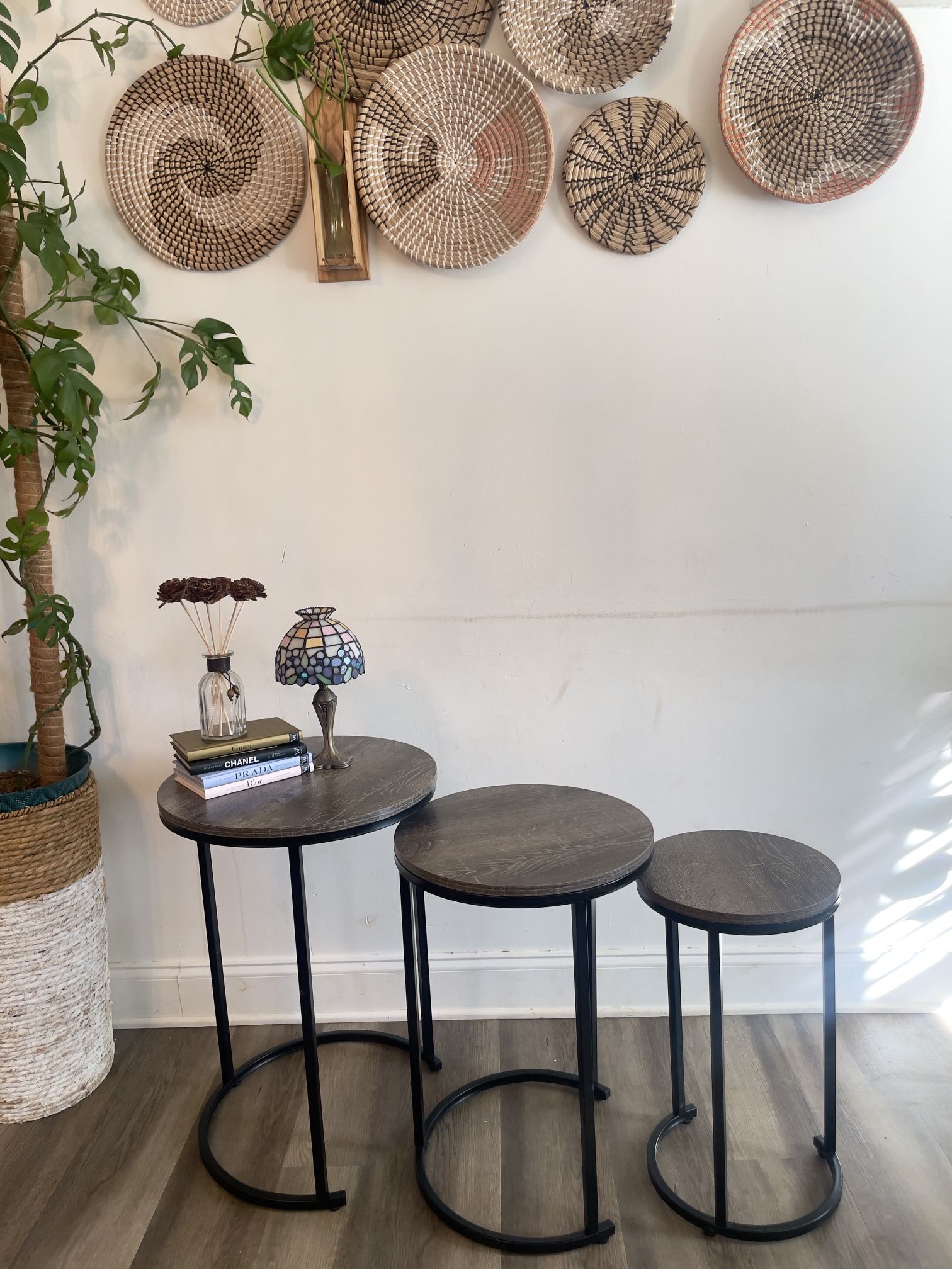 Stylish set of three nesting tables with a modern, minimalist look. Features dark wood tops with black metal legs—perfect for living rooms, bedrooms, or small spaces. Use together as a nesting set or separately as side tables, plant stands, or accent tables. Originally $110 on Wayfair. Dimension in the photos 'YES' it is available if you see the listing. Message to schedule pickup. Greensboro pickup. Cash only.