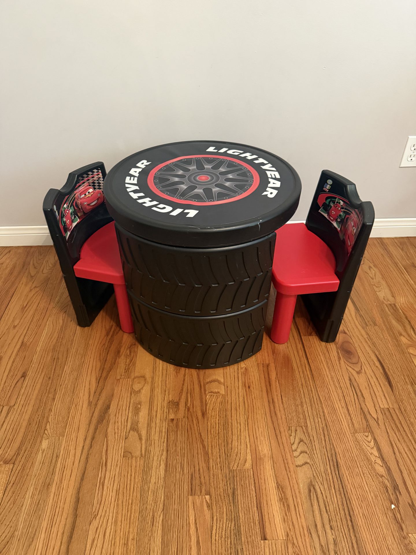 Mc Queen toddler table for the kid who loves Cars the Movie & friends . It’s a one of a kind toddle set . Part of my Moving sale ! Must sell .