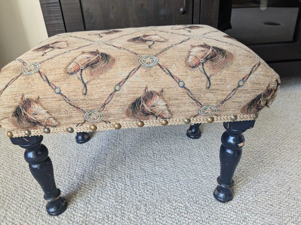 Cute foot stool, Antique ,could recover with different fabric if wanted. Height 12 inche ,long 18, wide13 inches.