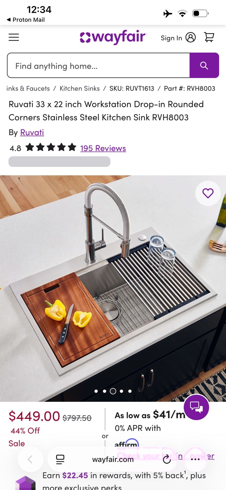 New, unopened Ruvati workstation drop-in kitchen sink. It comes with all accessories. Measurements in picture. Extra from renovation.