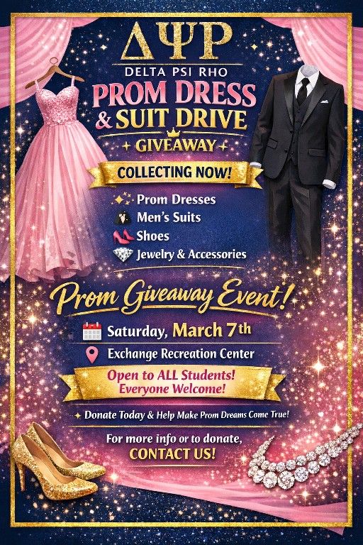 πβ¨ Delta Psi Rho Prom Dress & Suit Drive β¨π Making Prom Dreams Come True! Prom season is here, and Delta Psi Rho is committed to ensuring every student has the opportunity to attend prom feeling confident, celebrated, and stylish! ππ½πΊπ½ π Items Being Collected NOW π New & gently used Prom Dresses π€΅π½ Menβs Suits π Shoes π Jewelry & Accessories Your donation can help create unforgettable memories for students in our community. π PROM GIVEAWAY EVENT π Saturday, March 7th π Exchange Recreation Center π Open to ALL students β Everyone is Invited! π Want to Donate? If you have items to give or would like to support this initiative, please contact me directly. Together, letβs show up, give back, and help students shine on one of the most memorable nights of their lives! β¨ππ Delta Psi Rho β Service β’ Sisterhood β’ Impact