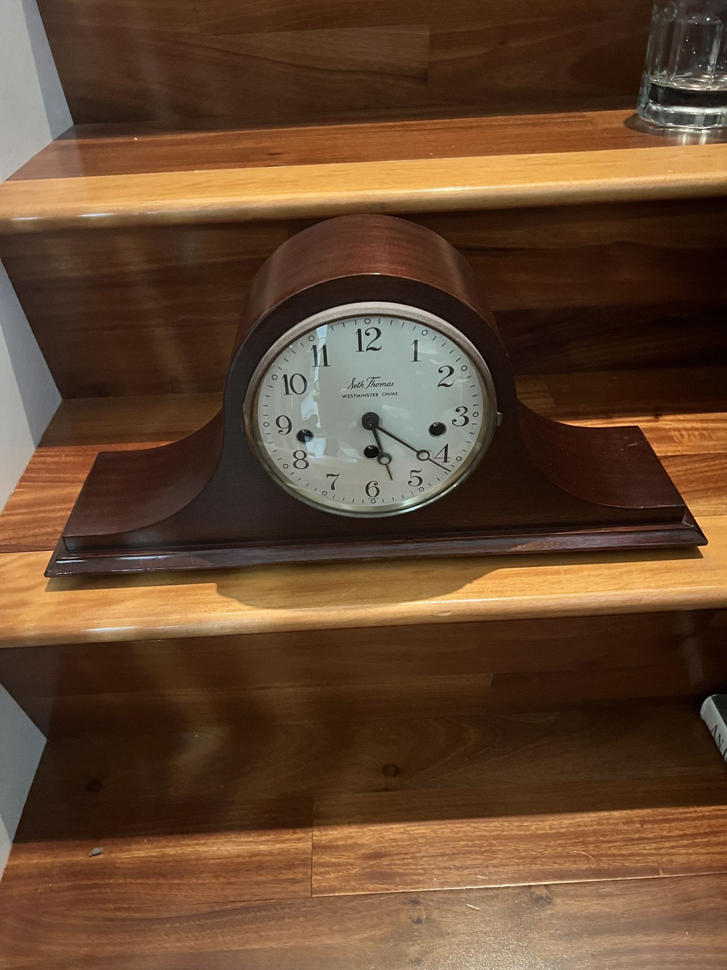 This is a 1977 Seth Thomas mahogany key winding Westminster chime mantle clock. The clock is an excellent condition and it’s an 8 day chime clock. It chimes every 15 minutes and on the hour. The key is enclosed. The clock is 17” wide c 8 inches high. Glass front door. The clock is in working condition