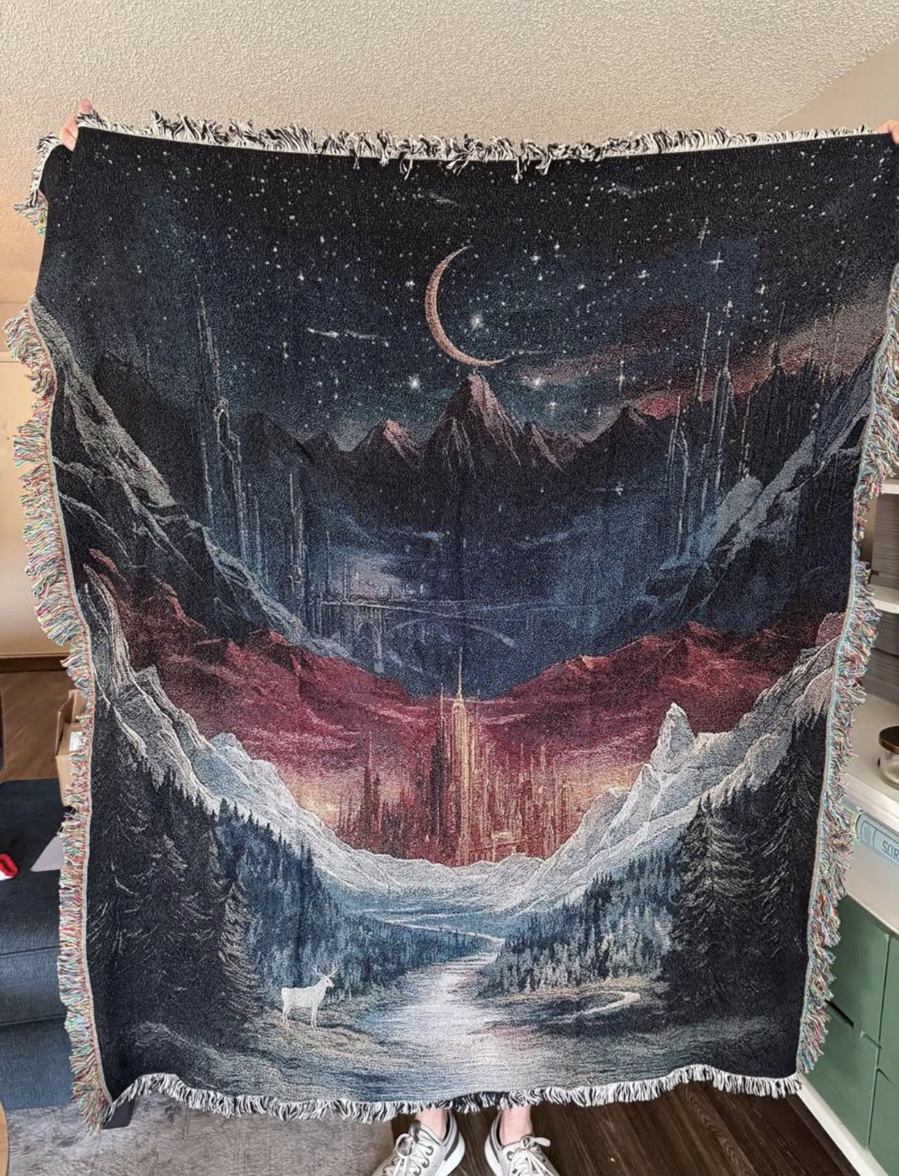 Fantasy tapestry blanket. 54in x 72in. Depicts the three worlds from Sarah J. Maas’ Throne of Glass, Crescent City, and A Court of Thorns and Roses. Received for Christmas and has never been used. Comes from a non-smoking home.