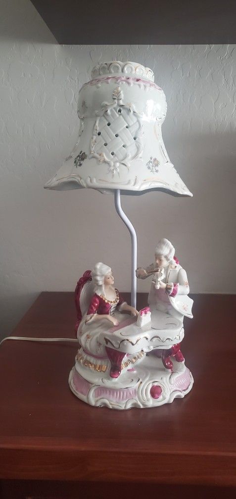 Countess/Lady playing piano Lilac grenadine and gold accent in color and baron playing the violin , great condition lamp works.