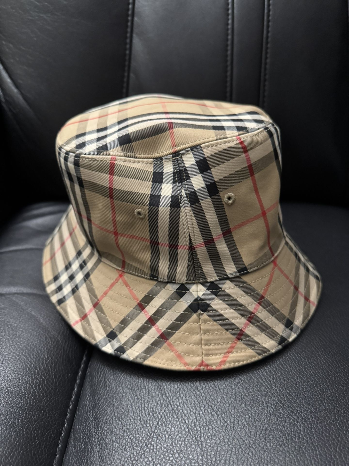 Genuine Burberry reversible bucket hat bought from the Burberry store for $400. One side is the classic Vintage Check plaid (beige with black/red accents), the other is solid black. Size 59 (fits medium-large, ~23 inches circumference). Barely worn, no flaws—fabric is crisp and clean. No receipt, but all authentic details: precise pattern, high-quality cotton gabardine, and internal sizing tag. Great for casual outfits or rain protection. Asking $325 OBO. Local pickup preferred, or ship for extra $10. Cash, Venmo, or Zelle accepted. Serious buyers only!