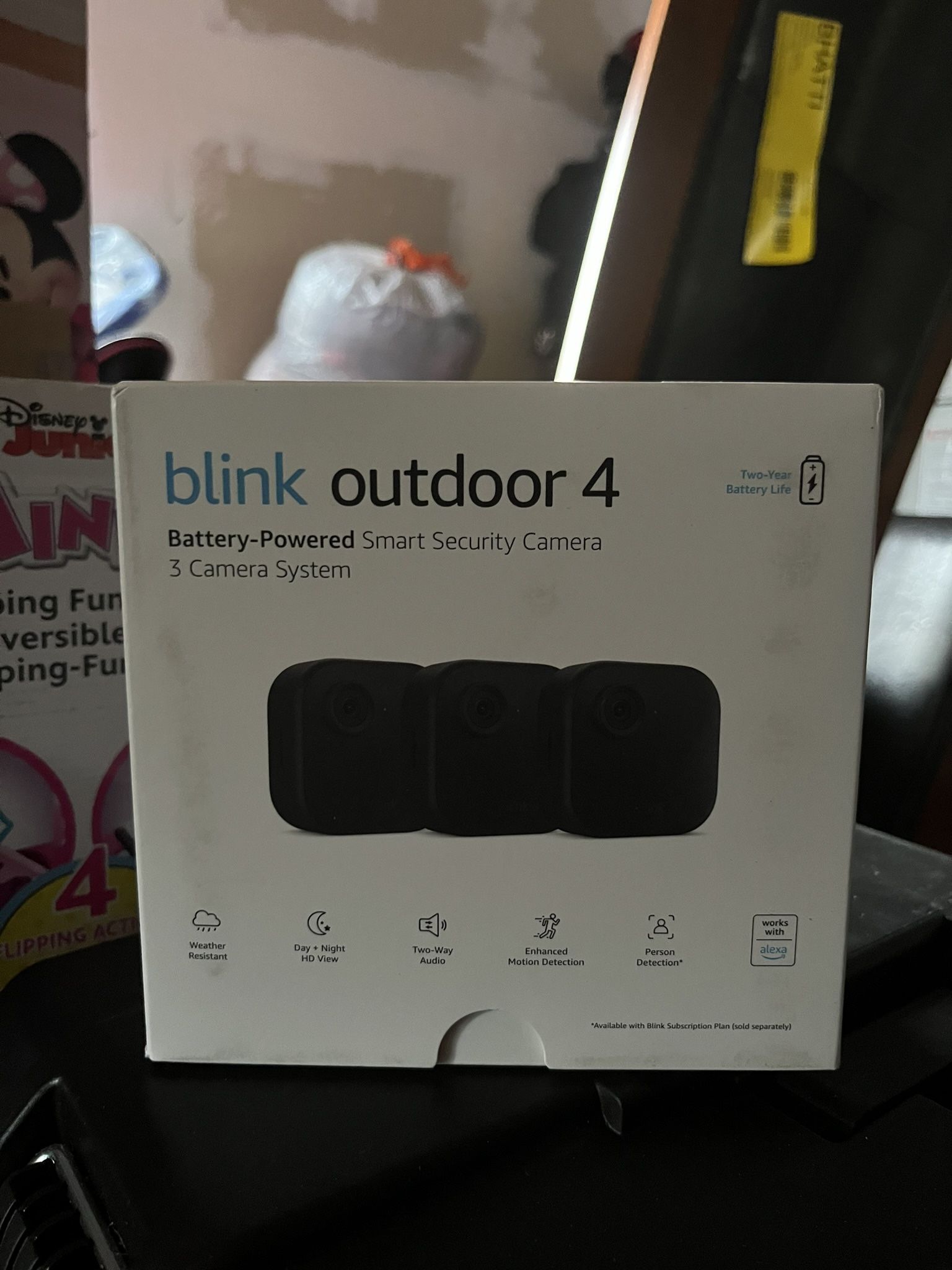 Brand New Sealed! Outdoor 4 is our fourth generation wire-free smart security camera that helps you protect your home inside and out right from your smartphone. See and speak from the Blink app — Experience 1080p HD live view, infrared night vision, and crisp two-way audio. Two-year battery life — Set up yourself in minutes and get up to two years of power with the included AA lithium batteries. Enhanced motion detection — Be alerted to motion faster from your smartphone with dual-zone, enhanced motion detection. Person detection — Get alerts when a person is detected with embedded computer vision (CV) as part of an optional Blink Subscription Plan (sold separately). Save and share clips — Choose to store events in the cloud with a free 30-day trial of the Blink Subscription Plan or locally with the Sync Module 2 (included) plus a USB drive (sold separately). Works with Alexa — Connect to an Alexa-enabled device to engage live view, arm and disarm your system, and more using your voice. Includes three Outdoor 4 cameras, one Sync Module 2, six AA lithium metal batteries, three mounting kits, one USB cable, and one power adapter.