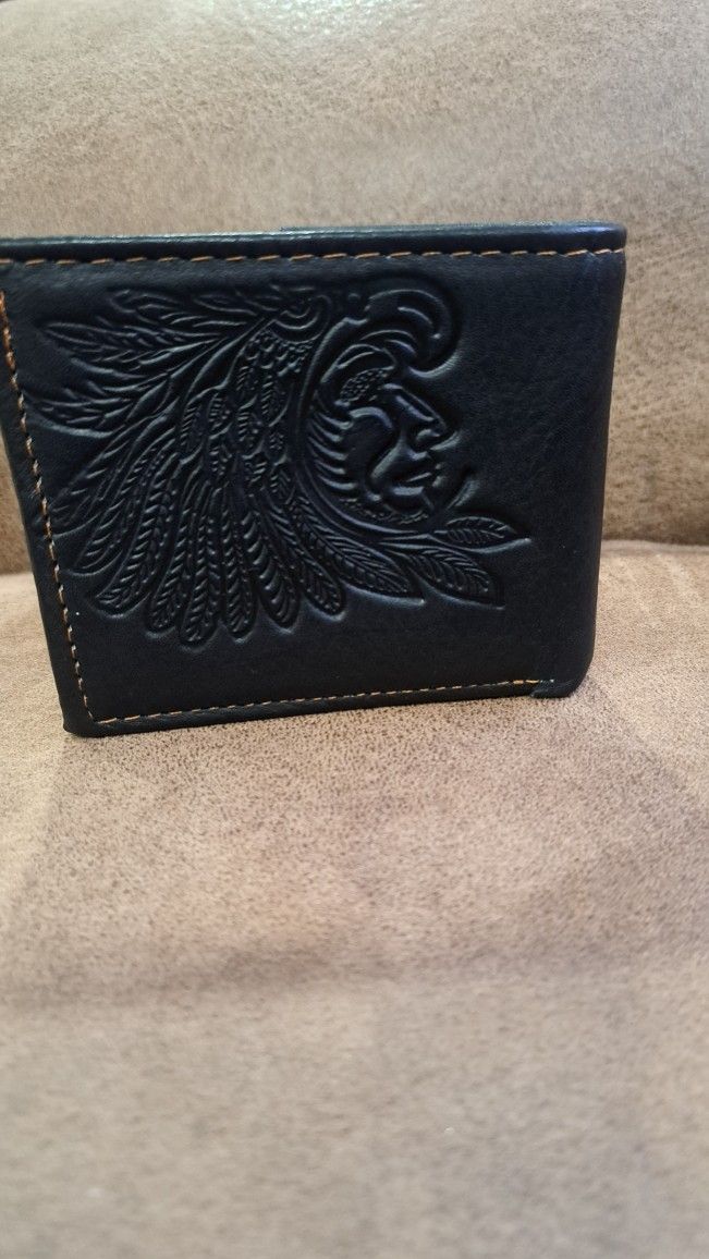 Made in Mexico, black leather wallet with Aztec calendar print.