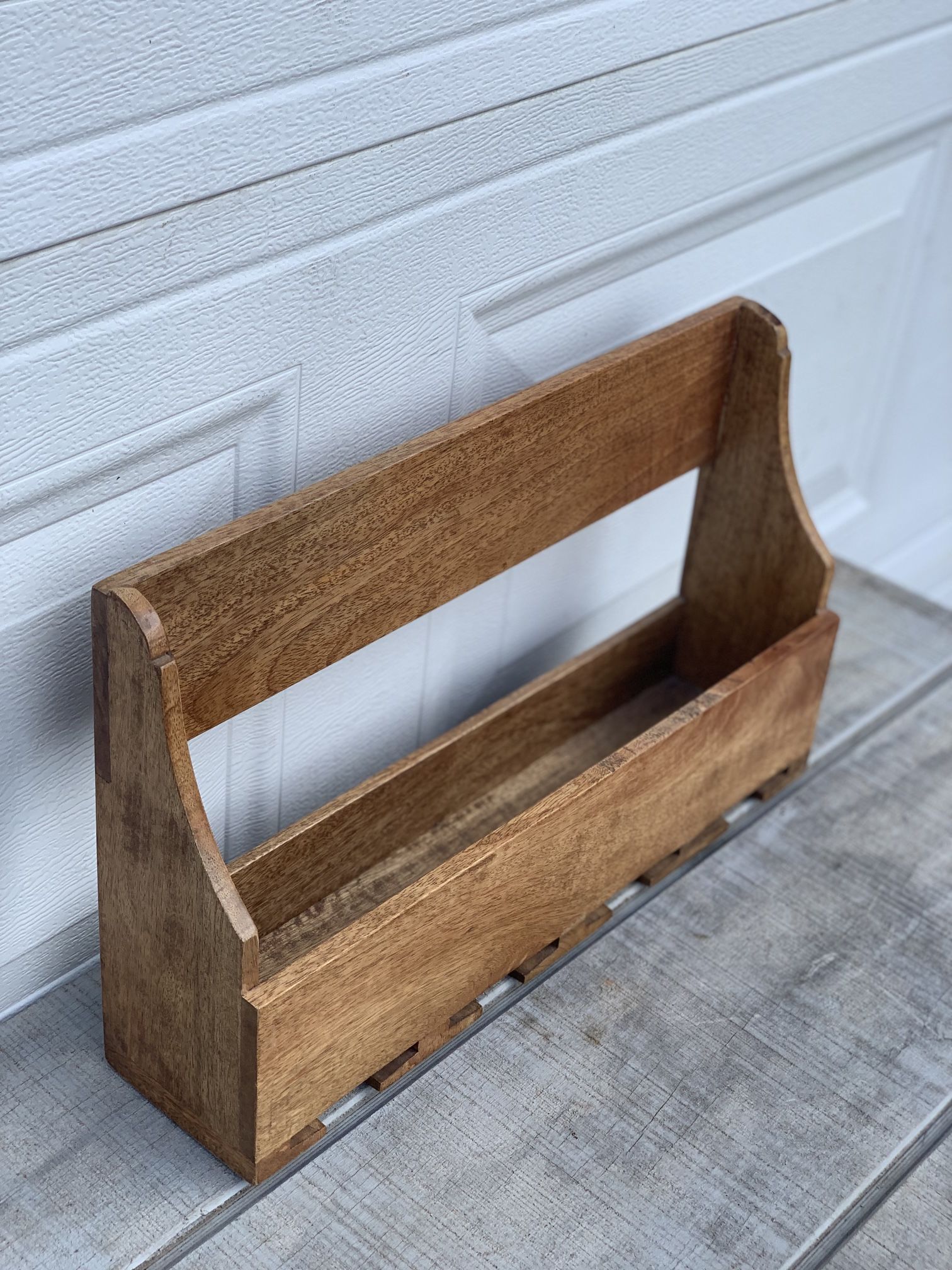 vintage wall-mounted bottle rack made of medium brown stained wood. It has four long stem glass holders and measures 11 inches in height, 4 3/8 inches in length, and 18 1/4 inches in width. The rack is made of solid wood and has a rectangular shape. It is perfect for those who want to display their bottles / jars and glasses in a personalized way