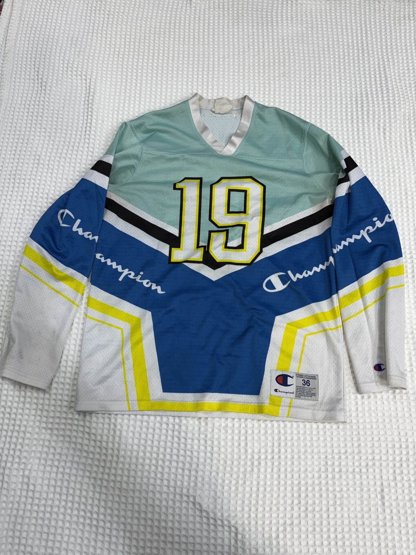 Champion 19 White/yel Two Blue V Neck Long Sleeve Jersey Men Sz S