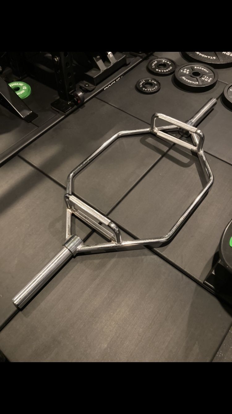 New condition Titan Fitness Hex Closed Trap Deadlift Barbell. Fits 2” Olympic plates. Nice small footprint unlike some others out there that are too big. Weight, weights, bumper plates, dumbbells, squat rack, adjustable bench, workout, exercise, train, safety spotters, Olympic barbell, home gym, storage, organize