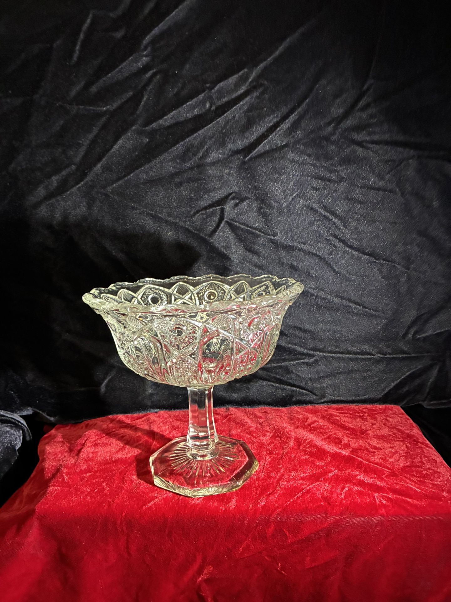 Beautiful vintage LE Smith pressed glass footed compote dish. It measures 6.26” tall with a 7” diameter on top and a 3.5” diameter on the bottom. Pickup in Wake Forest or buyer pays shipping if needed. Accept Pay PAL, Venmo, and cash for local sales .