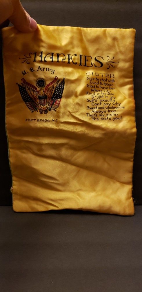 Vintage WWII era HANKIES Fort Bragg Letter Holder for my sister. Goldish/yellow front, green back. Still has band on back. Great nostalgic piece, sent home to a loved one's sister. Fort Bragg North Carolina $25/ Lorain pickup or Shipping Available I will not be Shipping through Offerup for a little bit- Offerup has not been paying out and instead just holding and accumulating sales. Shipping can be done outside of Offerup with Pay pal