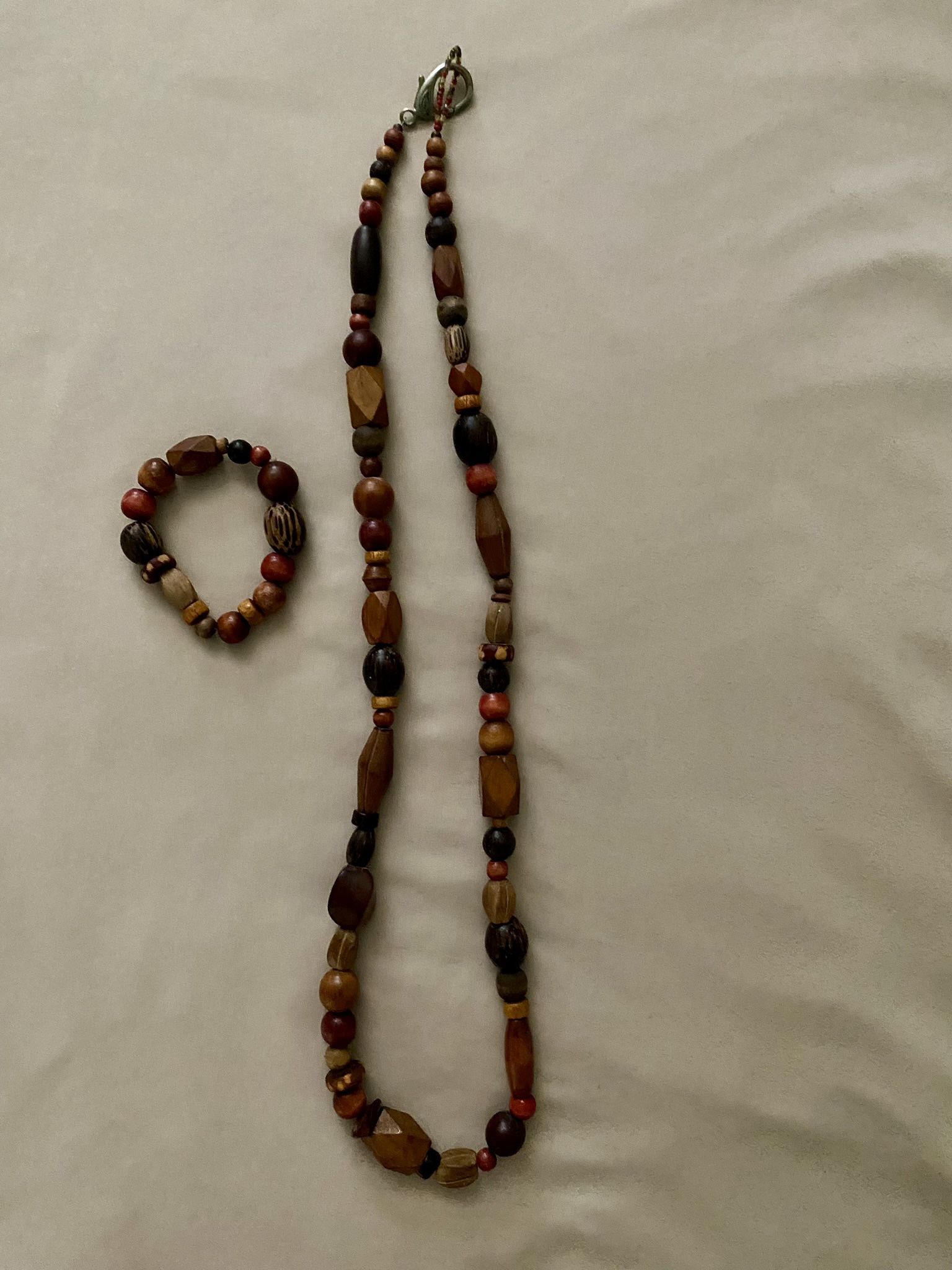 Darling multicolored wooden beads necklace, and slip on bracelet. Like new. Necklace measures 16“.