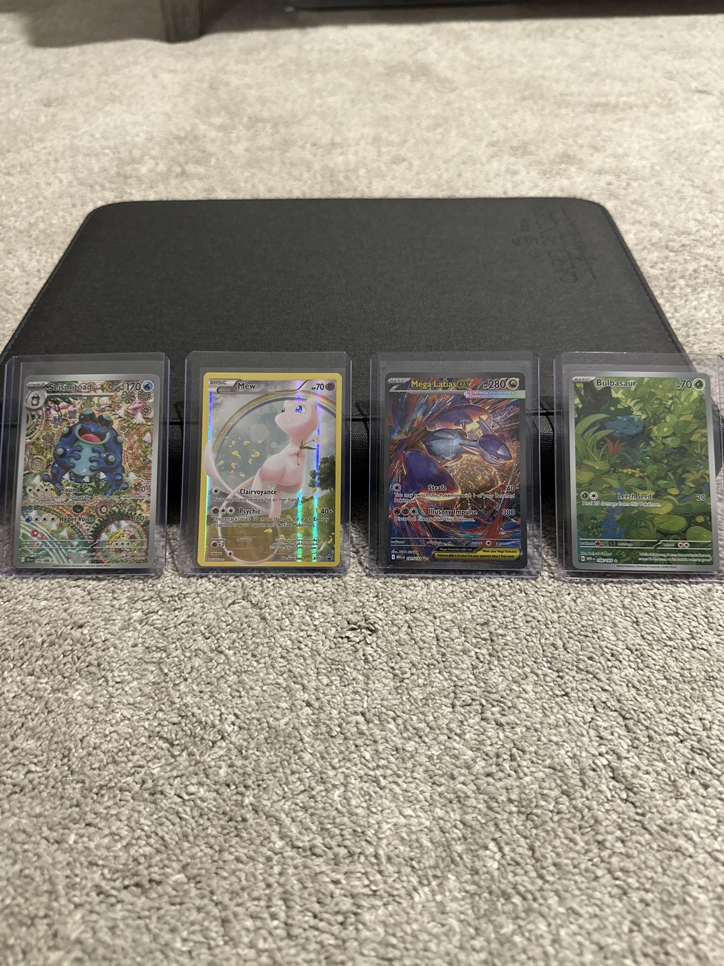 Mint Condition Mew XY promo - 118$ Seismitoad IR - 152$ Mega Latias SIR - 97$ Bulbasaur 151 IR - 42$ Pikachu Vmax secret UR - 14$ Buy all together for 400$