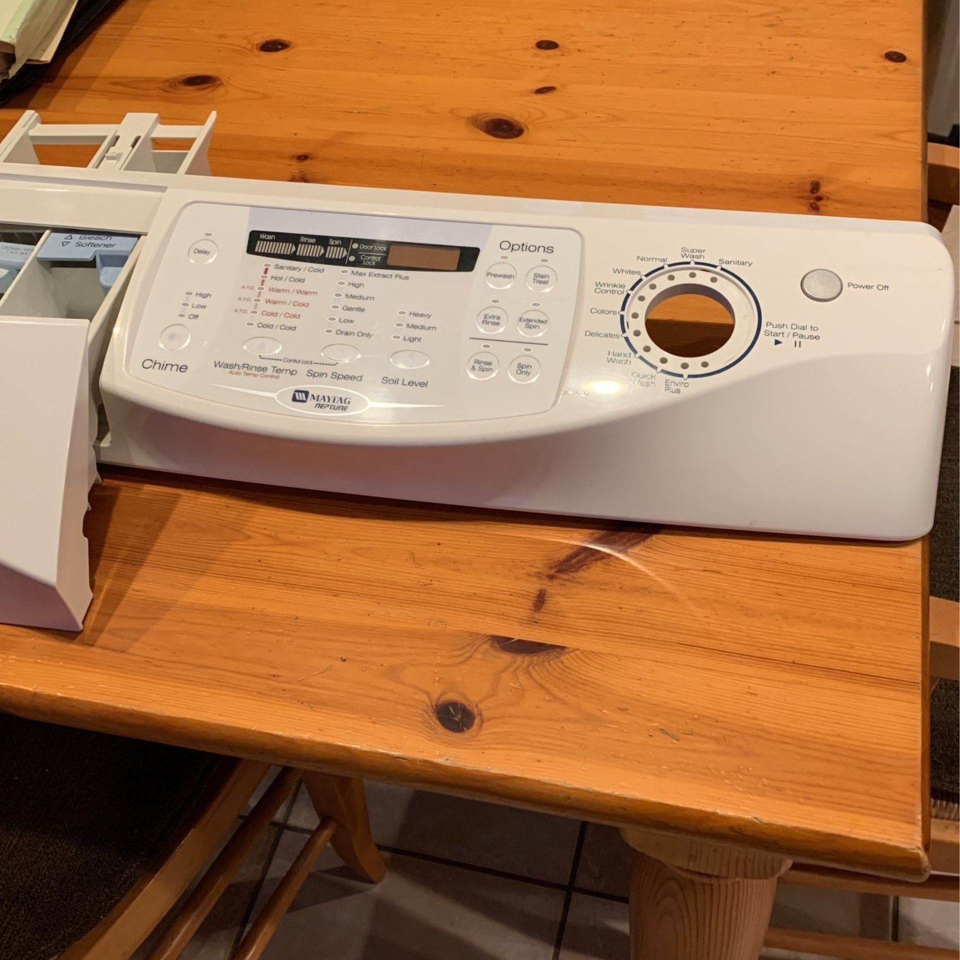 Maytag Neptune WAH9700 control panel faceplate; also soap dispenser.