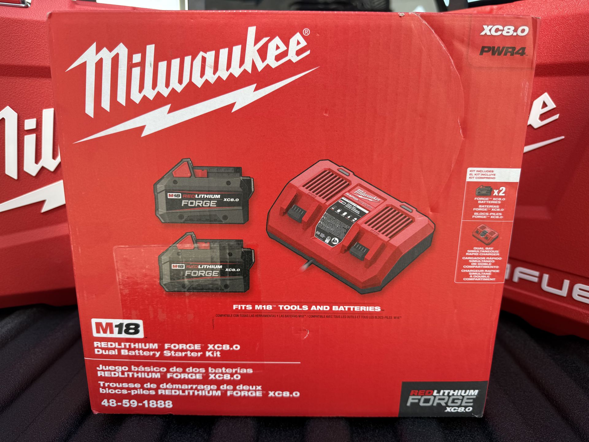 Kit Milwaukee M18 REDLITHIUM FORGE XC8.0 con dos baterías y cargador dual. Nuevo, sin uso. Compatible con toda la línea M18. Entrega en Napa Pago: efectivo, Zelle o Venmo I also speak English. You’re welcome to message me anytime.
